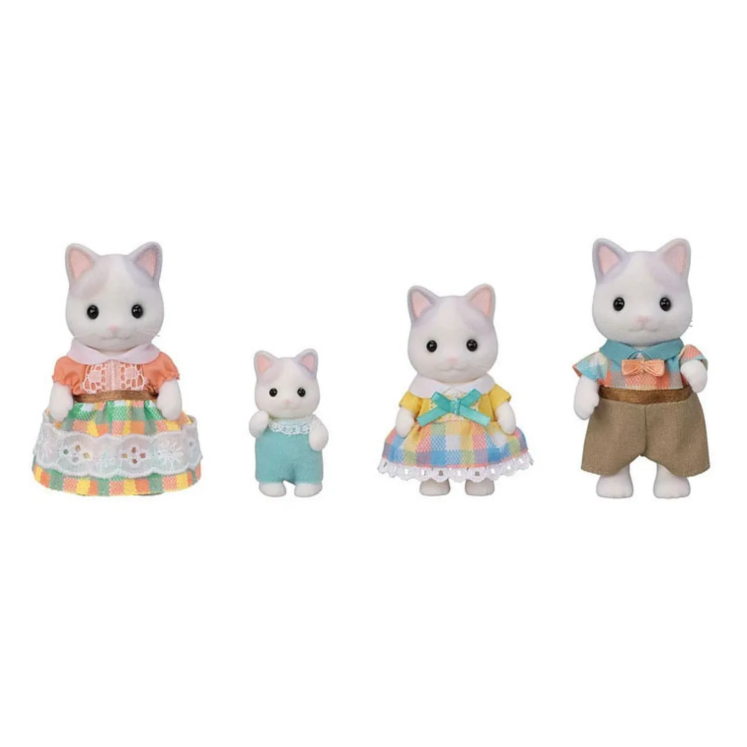 • De moeder, vader en het meisje dragen kleurrijke geruite outfits in verschillende kleuren.