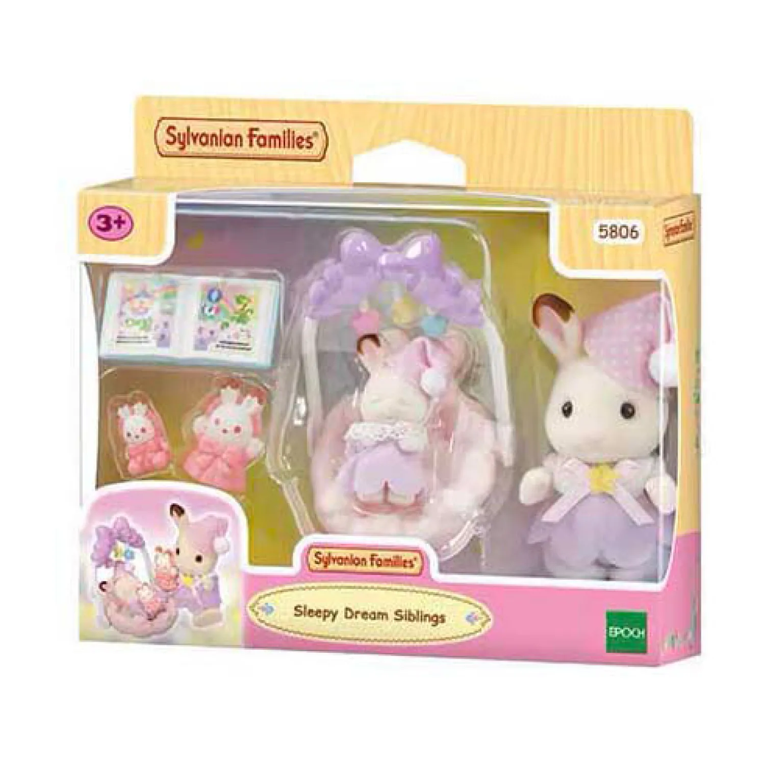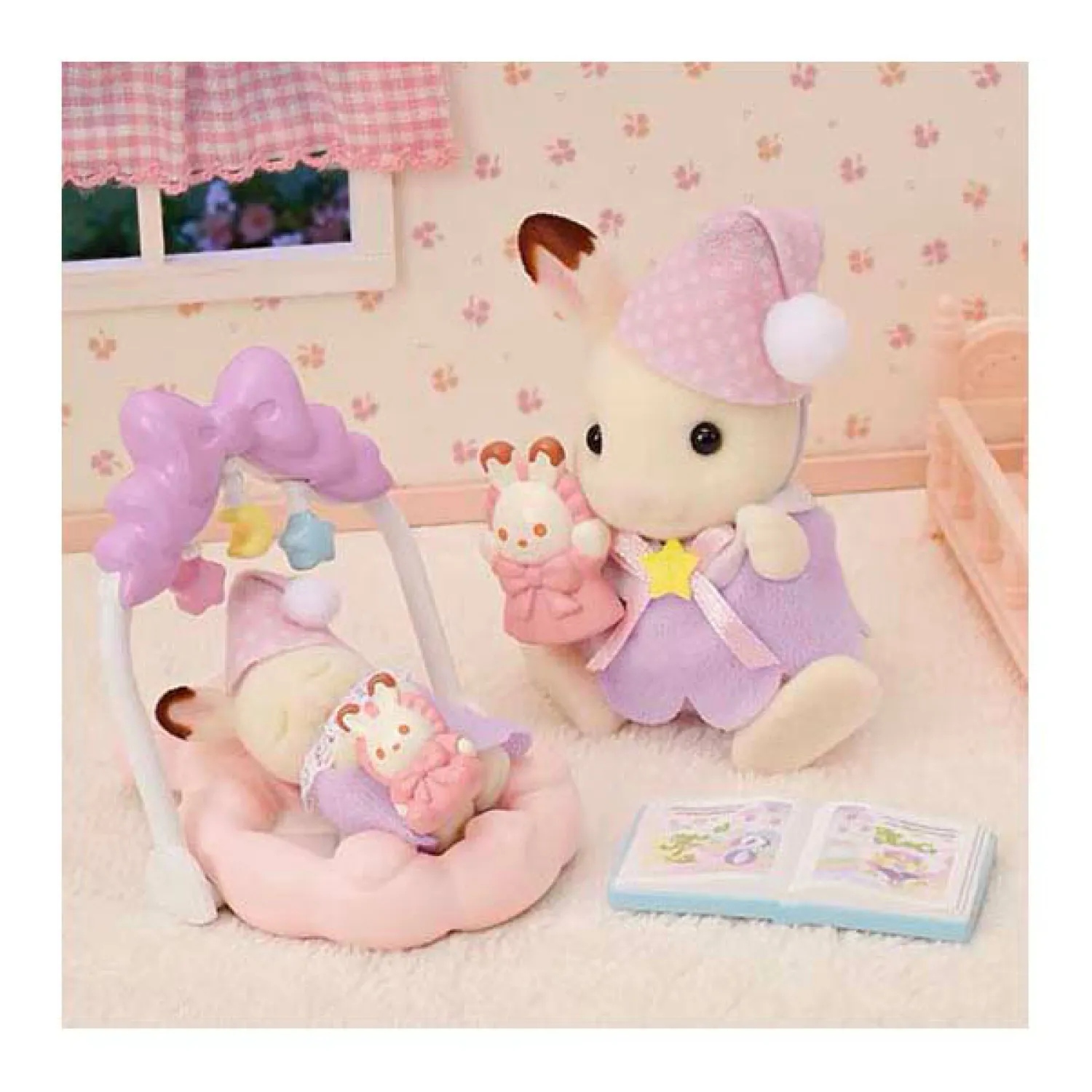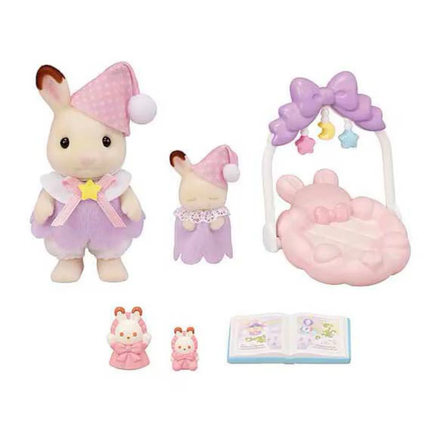 accessoires voor het bedtijdritueel. Baby Lapin Chocolat heeft haar ogen dicht. De pop kan op de hand van Freya geplaatst worden. De figuren zijn gearticuleerd en met zorg aangekleed. Hun kleren kunnen naar believen worden uit- en aangetrokken. Inhoud: Het Lapin Chocolat meisje, de Lapin Chocolat baby, een box, een mobiel, een pop, een knuffel, een prentenboek.