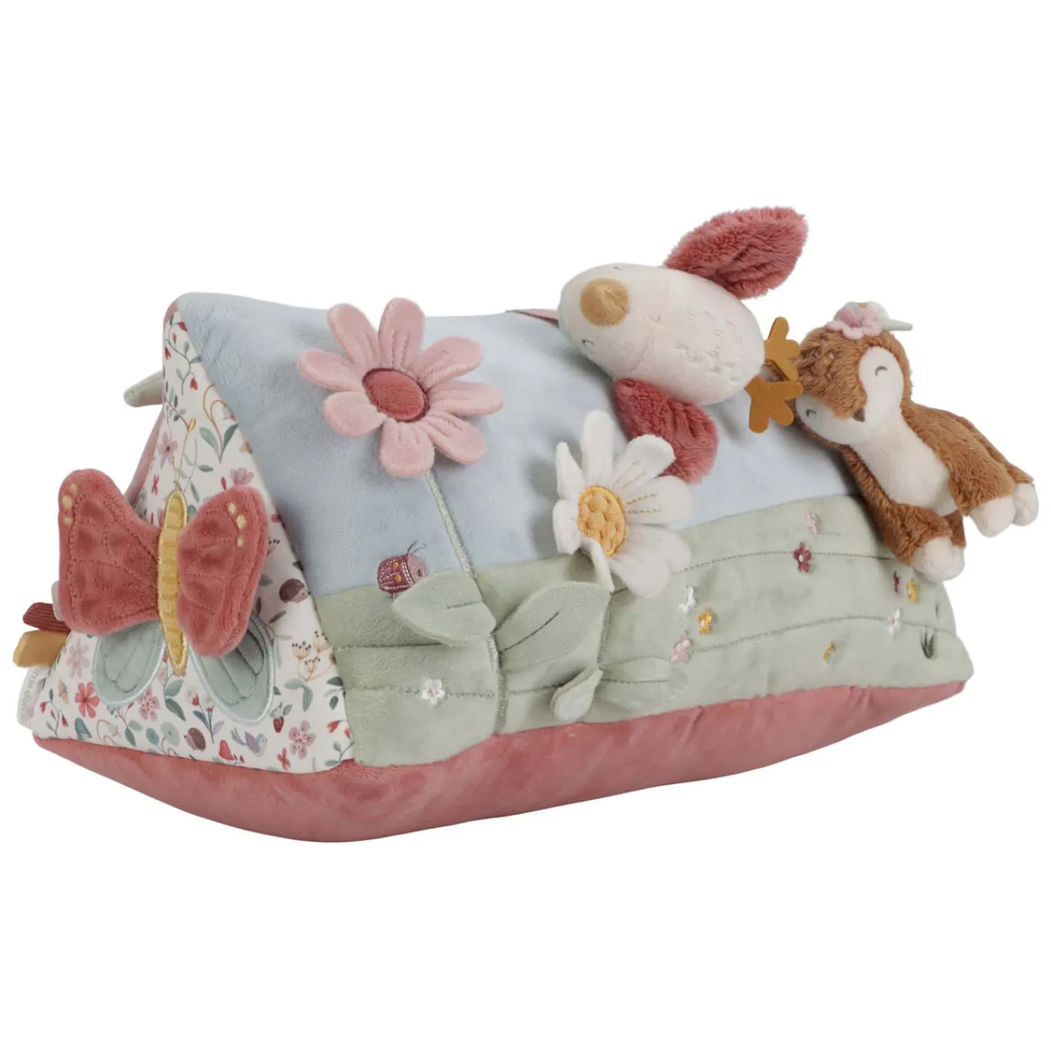 Ontdek de schoonheid en geheimen van Fairy Garden terwijl je op je buik ligt! Deze veelzijdige activiteitendriehoek neemt je kleintje mee op avontuur door een magische tuin. Onderweg valt er veel te ontdekken. Van knisperende bloemblaadjes tot een spiegeltje. Met zoveel activiteiten en verschillende texturen om de zintuigen en verbeeldingskracht te prikkelen zal je baby heerlijk zoet spelen.