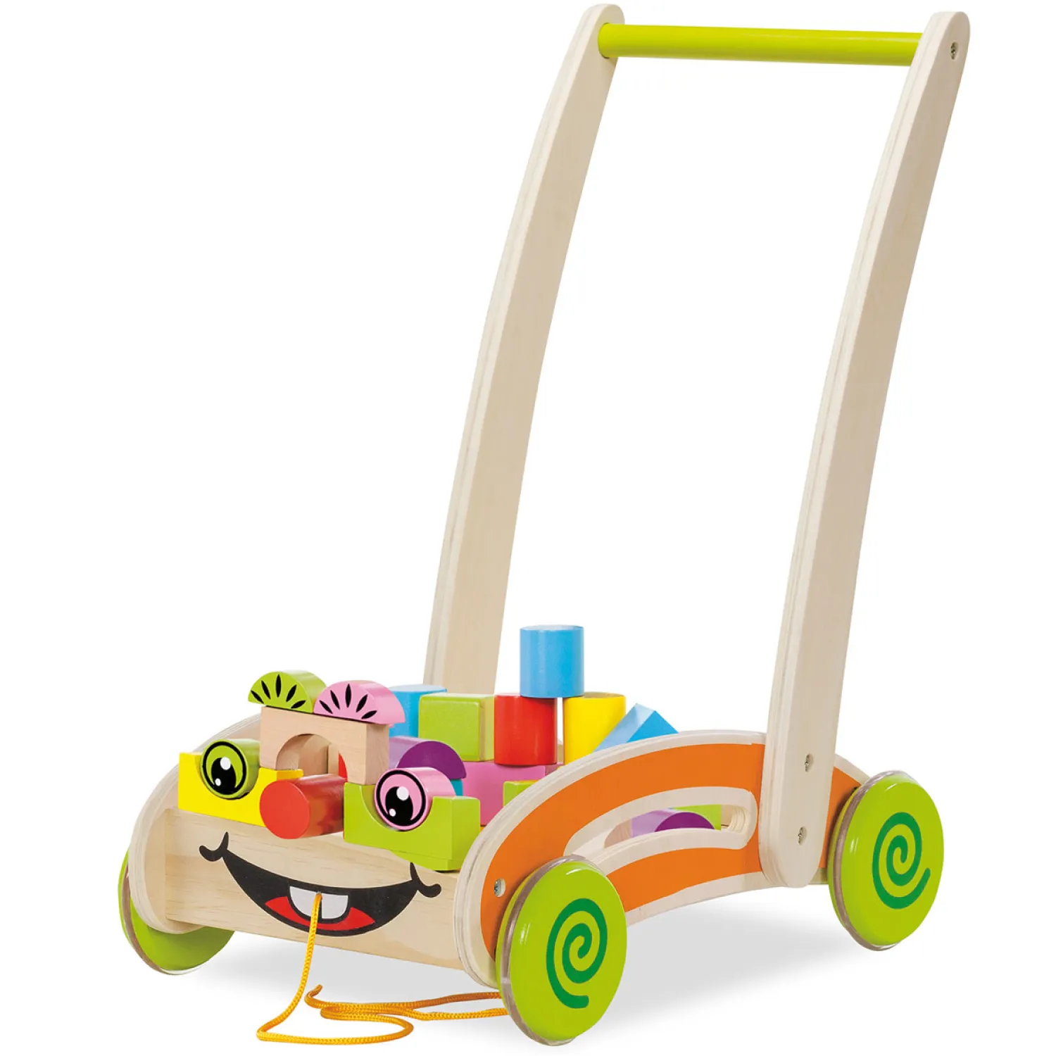 Ga op pad met deze Eichhorn speel- en loopwagen. Duw de stevige houten kar aan het brede handvat of trek hem aan het touw vooruit. Verzamel de 36 gekleurde houten blokken en neem ze mee op de speelwagen. Vanaf 12 maanden.