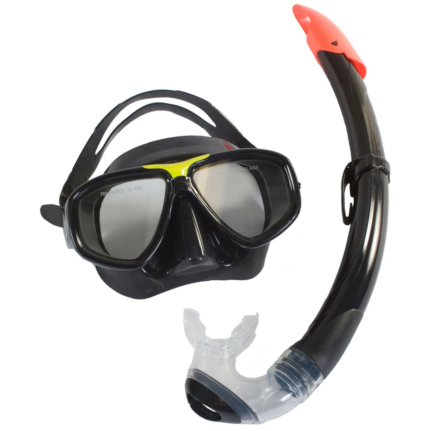 SportX Adult snorkelset, kwaliteit vier sterren, met lenzen van veilig tempered glass, silicone anti-lek pasvorm, ingebouwde waterloosklep, dubbele lenzen voor scherp zicht en comfortabel mondstuk. Wordt in de kleur zwart geleverd in clamshellverpakking. Geschikt voor volwassenen.