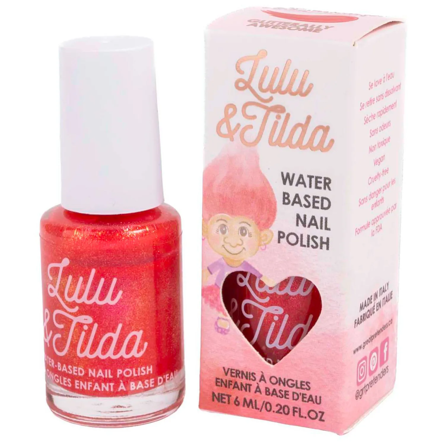 Maak kennis met de Glitterally Awesome Washable Nail Polish van Lula and Tilda, een gedurfde en leuke manier voor je kleintjes om een vleugje knalrood op hun nagels te toveren! Deze nagellak, gemaakt in Italië, is speciaal voor kinderen ontwikkeld. De nagellak is niet-giftig, veganistisch en bevat geen agressieve chemicaliën. Ouders kunnen gerust zijn, want deze speelse nagellak is volledig veilig, terwijl kinderen zorgeloos van de glitter kunnen genieten.