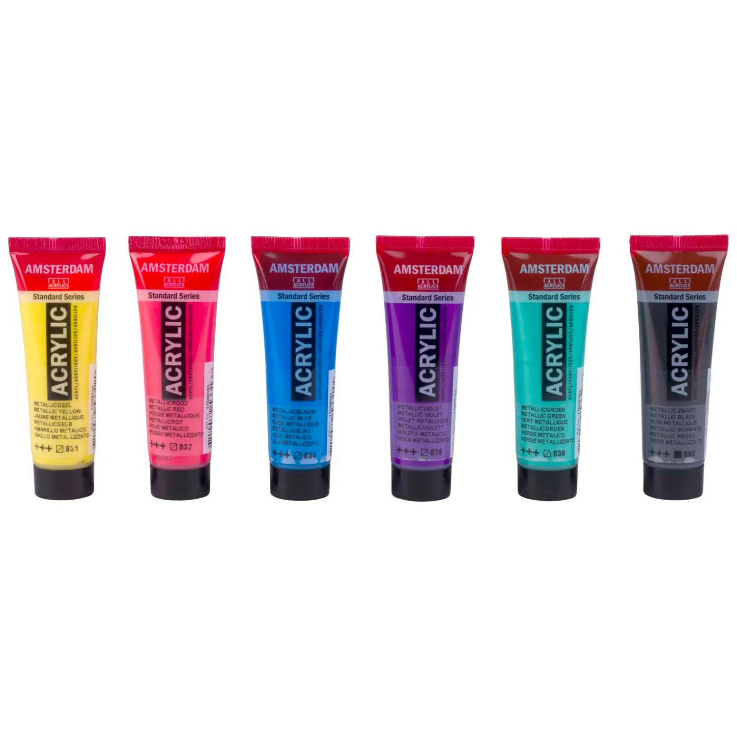 Inhoud: 6 x 20 ml tubes (831 Metallic Geel – 832 Metallic Rood – 834 Metallic Blauw – 835 Metallic Violet – 836 Metallic Groen – 850 Metallic Zwart).