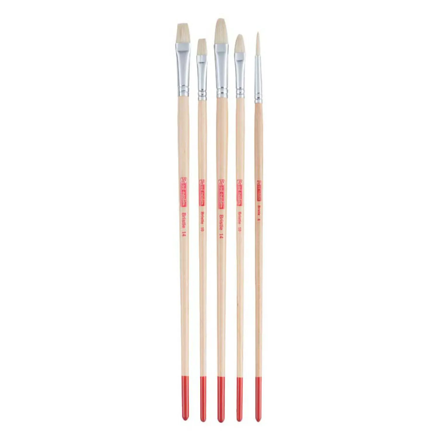 Deze set met 5 penselen van varkenshaar is geschikt voor olie-, acryl- en plakkaatverf (gouache). De set bevat de volgende soorten en maten: rond penseel in maat 6, 2 kattentongpenselen in maat 10 en 14, 2 platte penselen in maat 10 en 14.