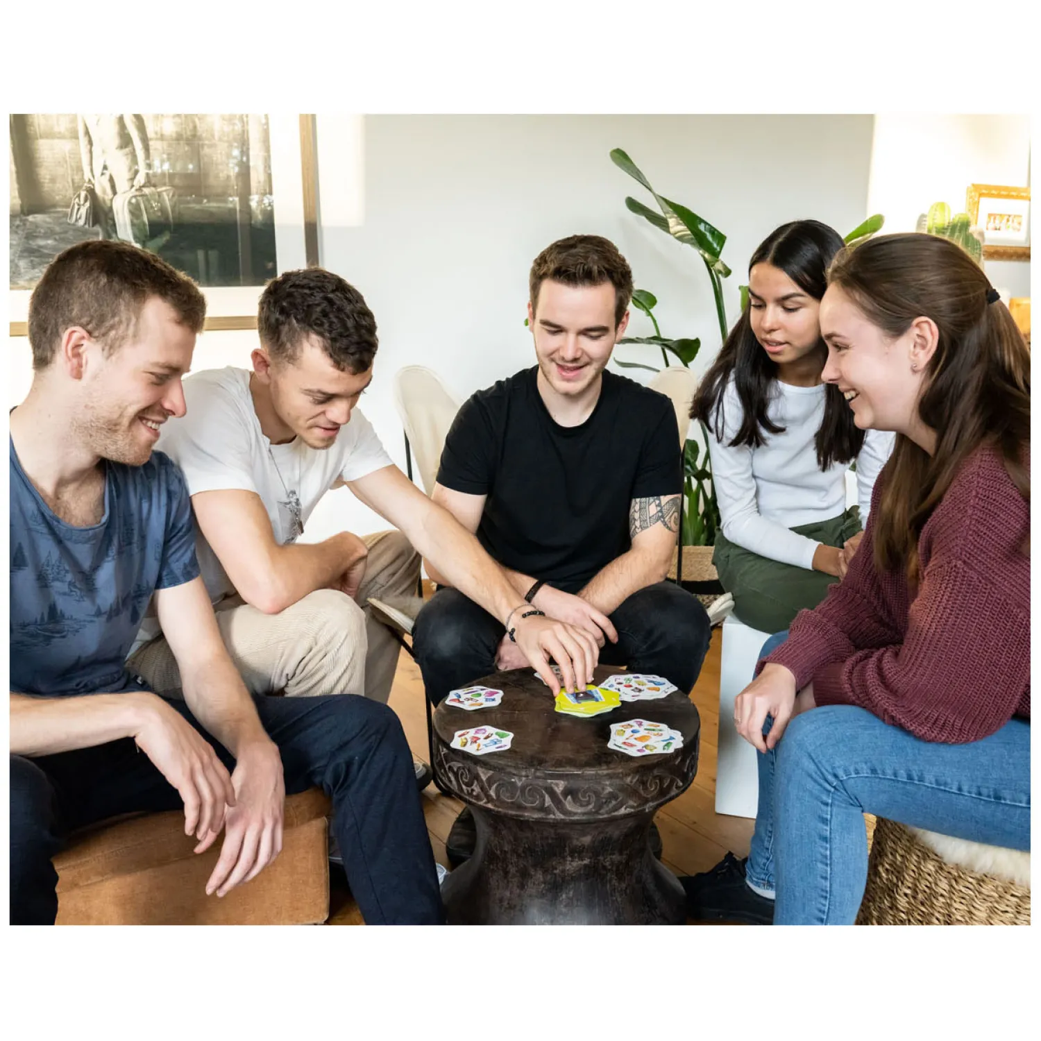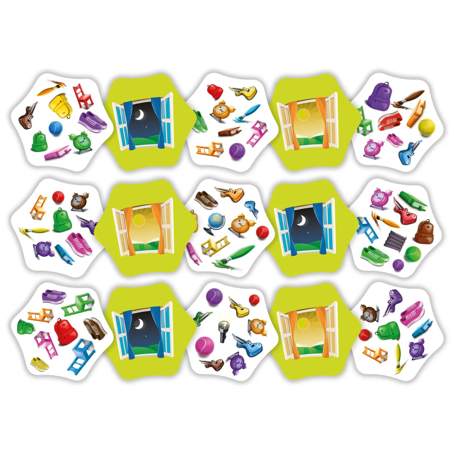 Draai een kaart om, doorzoek de rommelige kamer en probeer als eerste de kleur of het figuur te vinden die het meest voorkomt.