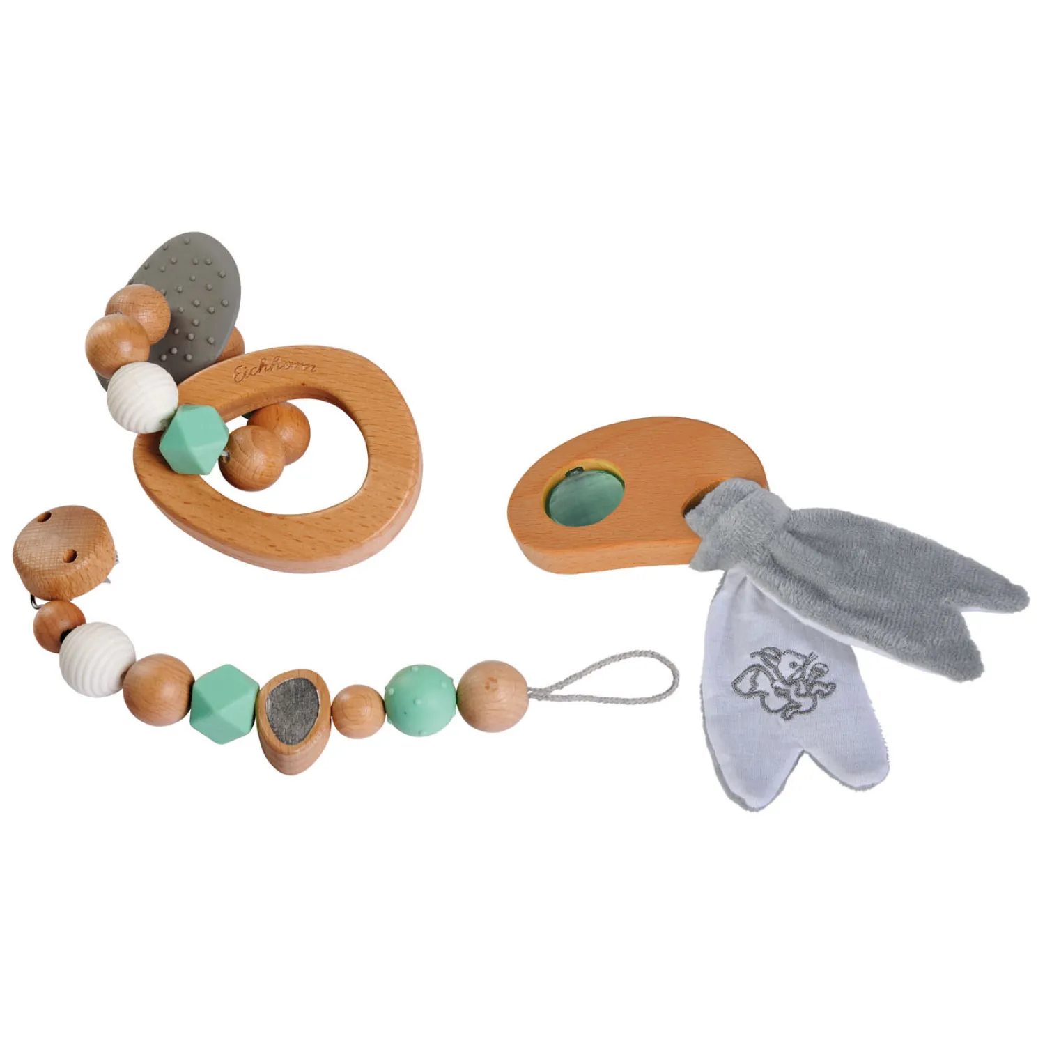 De houten cadeauset bestaat uit 3 prachtige kraamcadeautjes: een schattig speenkoord, een bijtring en een houten visje. Alle speelgoedjes zijn gemaakt van verschillende materialen: hout, rubber, kunststof en pluche stof. Hierdoor is het heerlijk voelen en ontdekken voor een baby’tje. Het hout is 100% FSC gecertificeerd beukenhout.