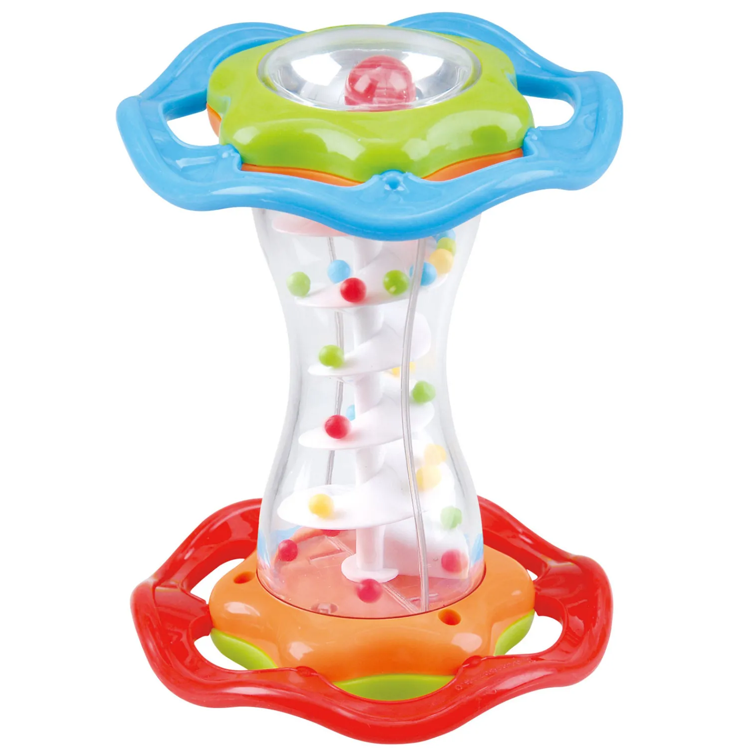 Ontdek en ontwikkel met deze baby ratel van Play. De vrolijke ratel is gemaakt van stevig kunststof en heeft handvatten met extra grip. Draai aan de bovenzijde en de vrolijk gekleurde balletjes roteren door de transparante buis. Bovenop is bovendien een extra balletje in een spiegeltje geplaatst. Spelen met de ratel prikkelt de zintuigen en stimuleert de ontwikkeling van de motoriek.