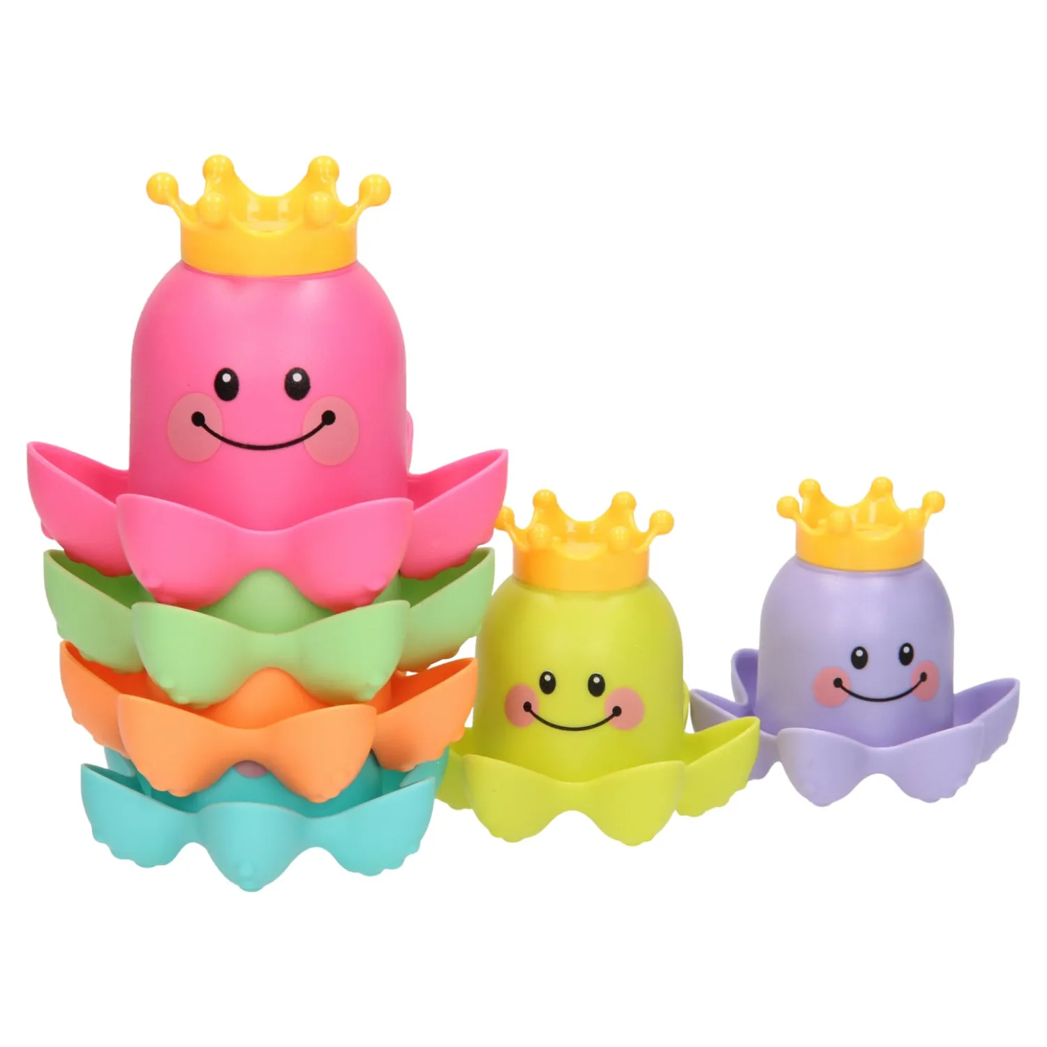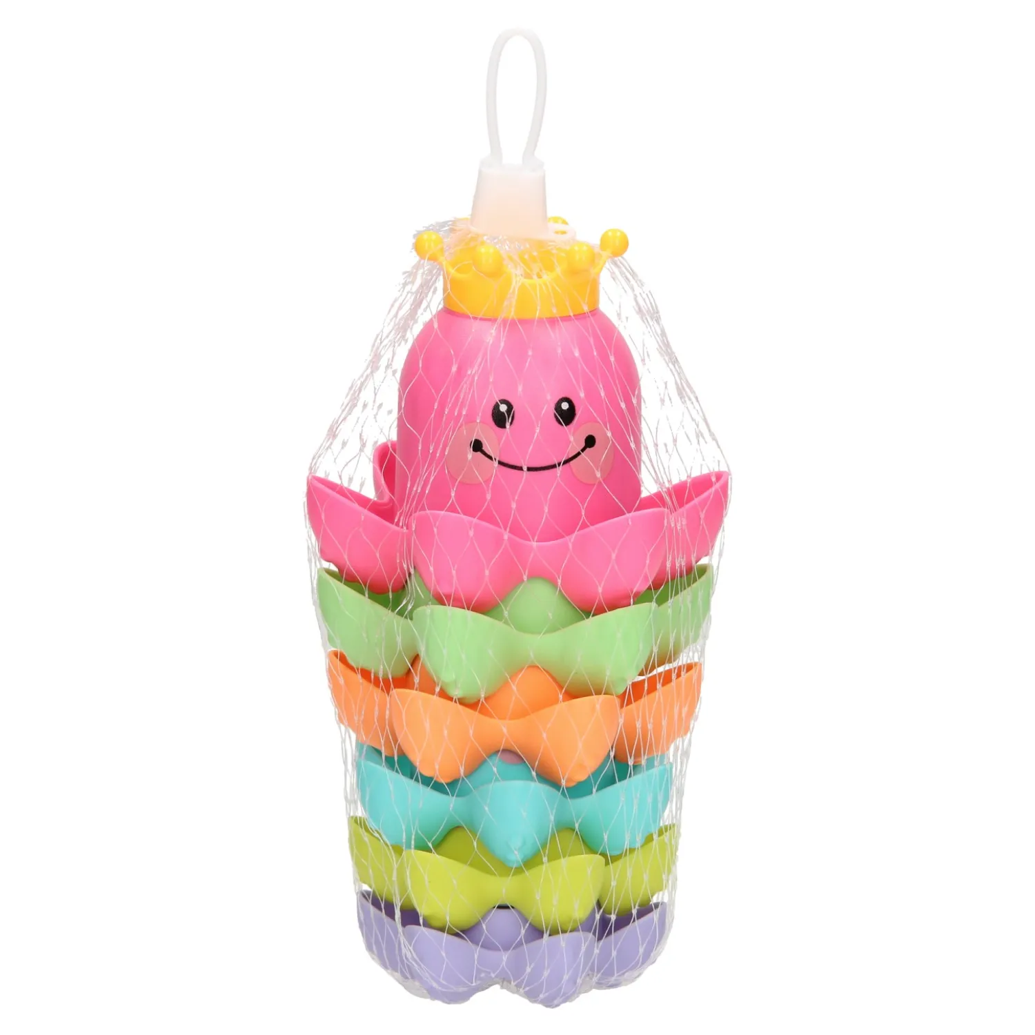 Met dit vrolijke badspeelgoed kun je de kleine wel even vermaken! De kunststof stapelbekers hebben de vorm van een octopus zijn bedrukt met een vrolijk gezichtje. Stapel de gekleurde bekers op elkaar of vul de bekertjes met water. Dankzij de gaatjes in het kroontje kunnen de bekers ook als gieter gebruikt worden.
