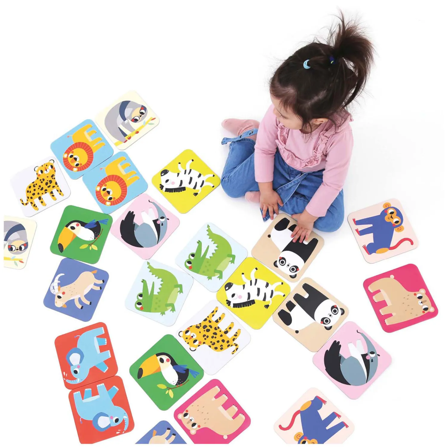 Begin met 2 of 3 paren en voeg vervolgens andere dieren toe naarmate uw kind vaardiger wordt. Leg de kaarten met de afbeelding naar beneden. Draai telkens twee kaarten om. Als ze hetzelfde zijn, leg ze dan opzij; zo niet, draai ze dan om. De speler met de meeste paren wint.