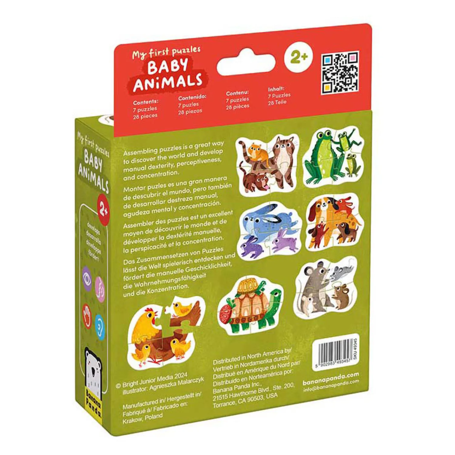 Vriendelijke babydieren en hun ouders nodigen je uit voor een leuke puzzeluitdaging. “Mijn eerste puzzel – Babydieren” is een educatieve set met 4 grote, kleurrijke puzzels, elk bestaande uit 4 grote stukken. Ontdek verschillende manieren om met deze puzzels te spelen: