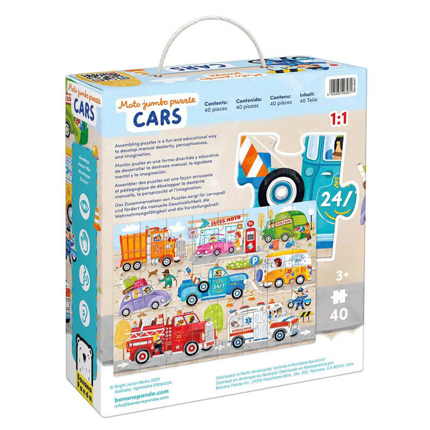In de geschenkdoos vind je een grote puzzel met 40 stukjes waarop allerlei auto’s, vrachtwagens en voertuigen in actie te zien zijn – de favorieten van kleuters. Tijdens het spelen verbeteren kinderen hun handvaardigheid, observatie en verbeelding.