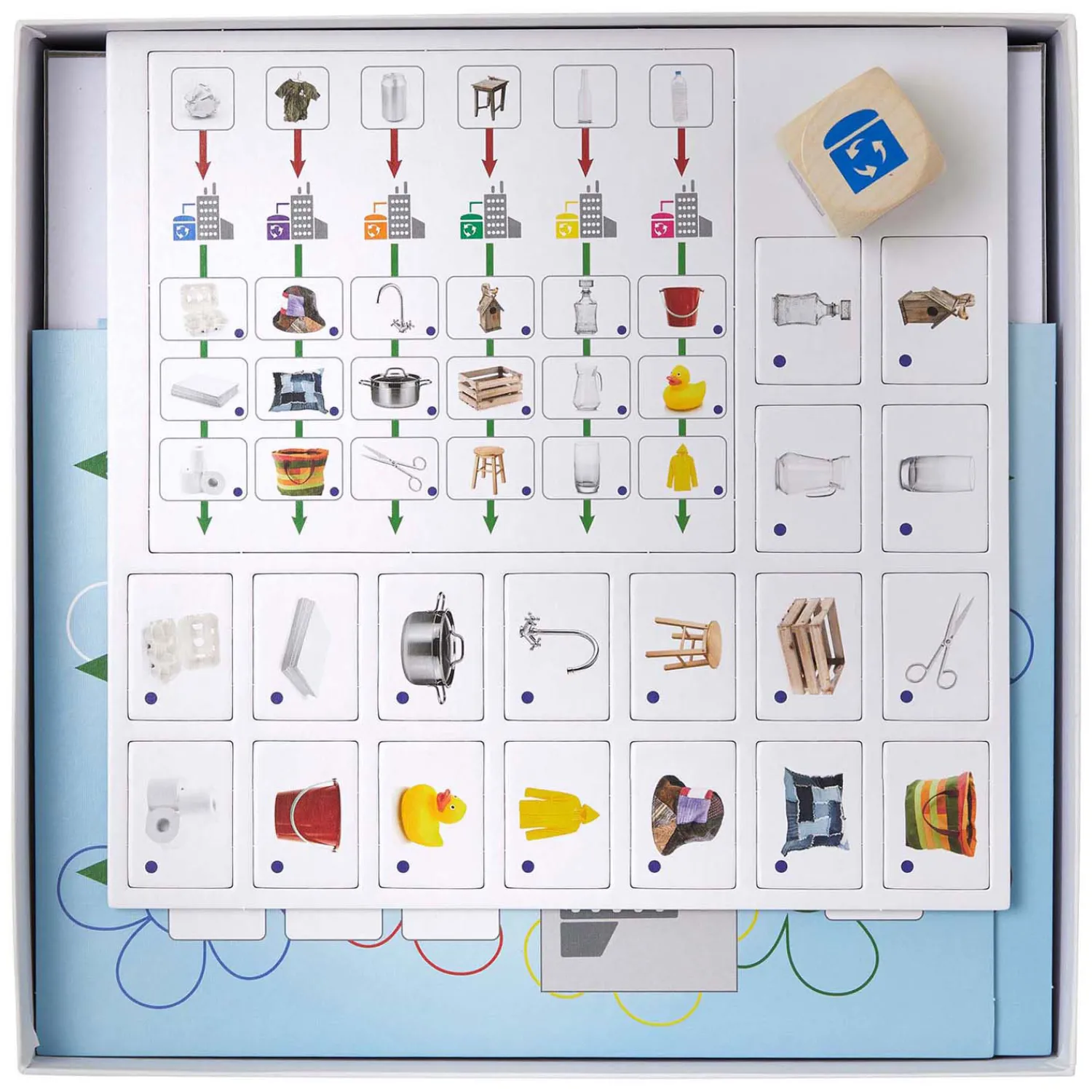 Om de beurt dobbelen de kinderen met de dobbelsteen, waarop 6 gekleurde fabrieken staan. Ze kijken op het spelbord welk materiaal in die kleur fabriek wordt gerecycled, pakken 1 recyclekaartje van een nieuw product en leggen dat kaartje onder die fabriek. De kinderen spelen door tot alle recyclekaartjes onder de fabrieken op het spelbord liggen. Met de controlekaart wordt gecontroleerd of alle kaartjes bij de juiste fabriek liggen.