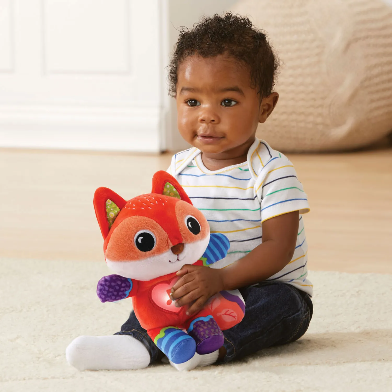 Druk op de knipperende hart-toets om lieve zinnetjes, rustgevende melodietjes, gezongen liedjes en geluiden te horen. Het rustgevende lichtje knippert langzaam mee met de muziek en geluiden. En de verschillende materialen en texturen stimuleren de tastzin. Laten we knuffelen!
