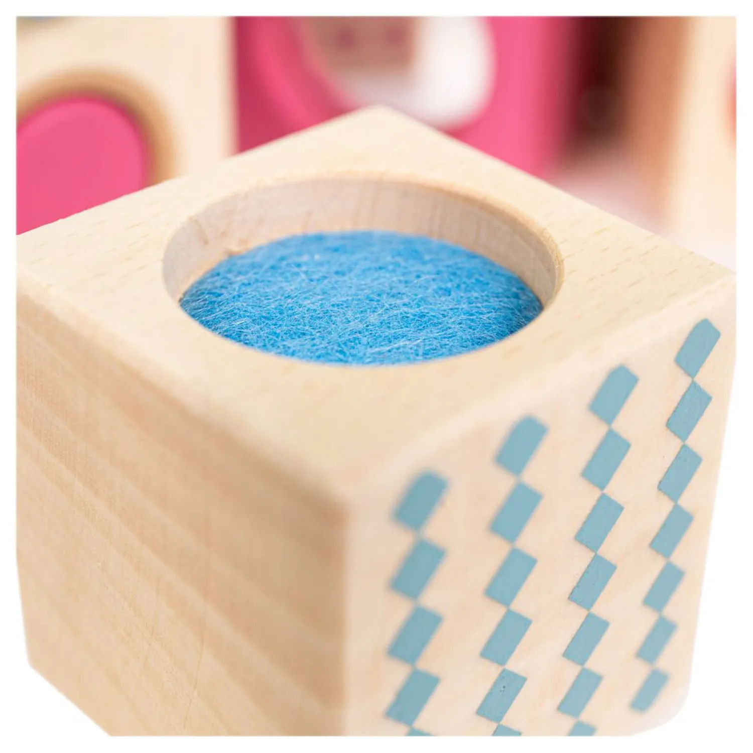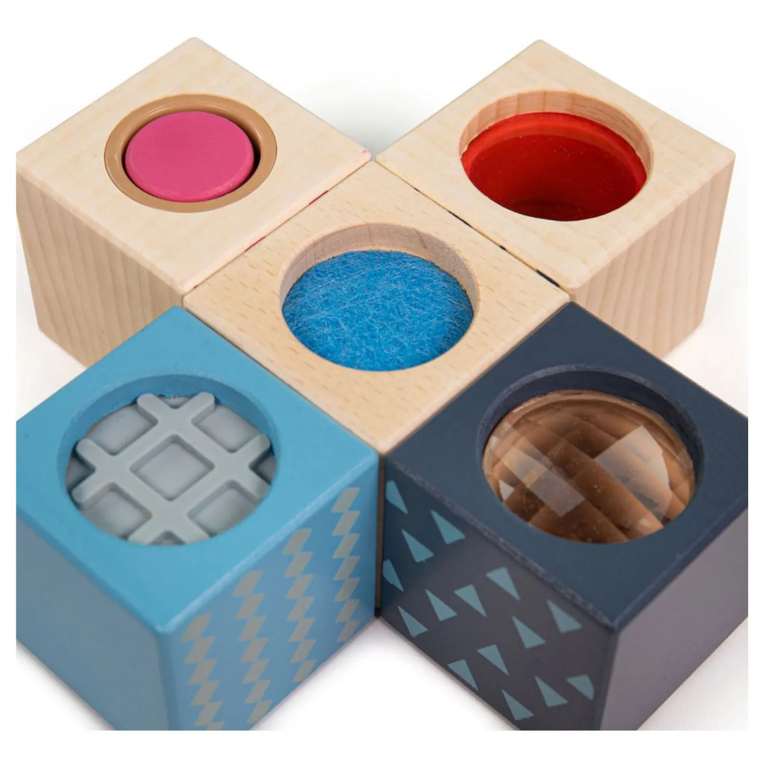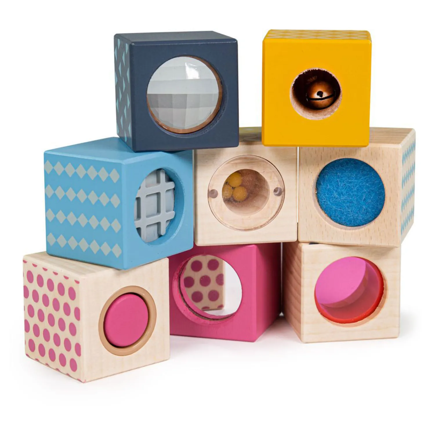 De acht houten blokken hebben elk een andere zintuiglijke ervaring, waaronder een rinkelend belletje, een spiegel, roze zoeker, optisch prisma, krassend vilt, cilinderpieper en rammelaars. De zintuigen van je kleintje worden geprikkeld door middel van aanraking, zicht en geluid – de sensorische blokken zijn gemaakt van glad hout en kindveilige lakken, dus zijn ook goed voor smaak- en geurdoeleinden! De sensorische blokken doen ook dienst als stapelspeelgoed, omdat elk blok op elkaar kan worden gestapeld. Deze stapelbare blokken zijn gemaakt van FSC®-gecertificeerde materialen (FSC® C147826) en zijn op de meest ethische manier mogelijk gemaakt. De kwaliteit van het hout zorgt er ook voor dat er jarenlang mee gespeeld kan worden. Conform de huidige Europese veiligheidsnormen.