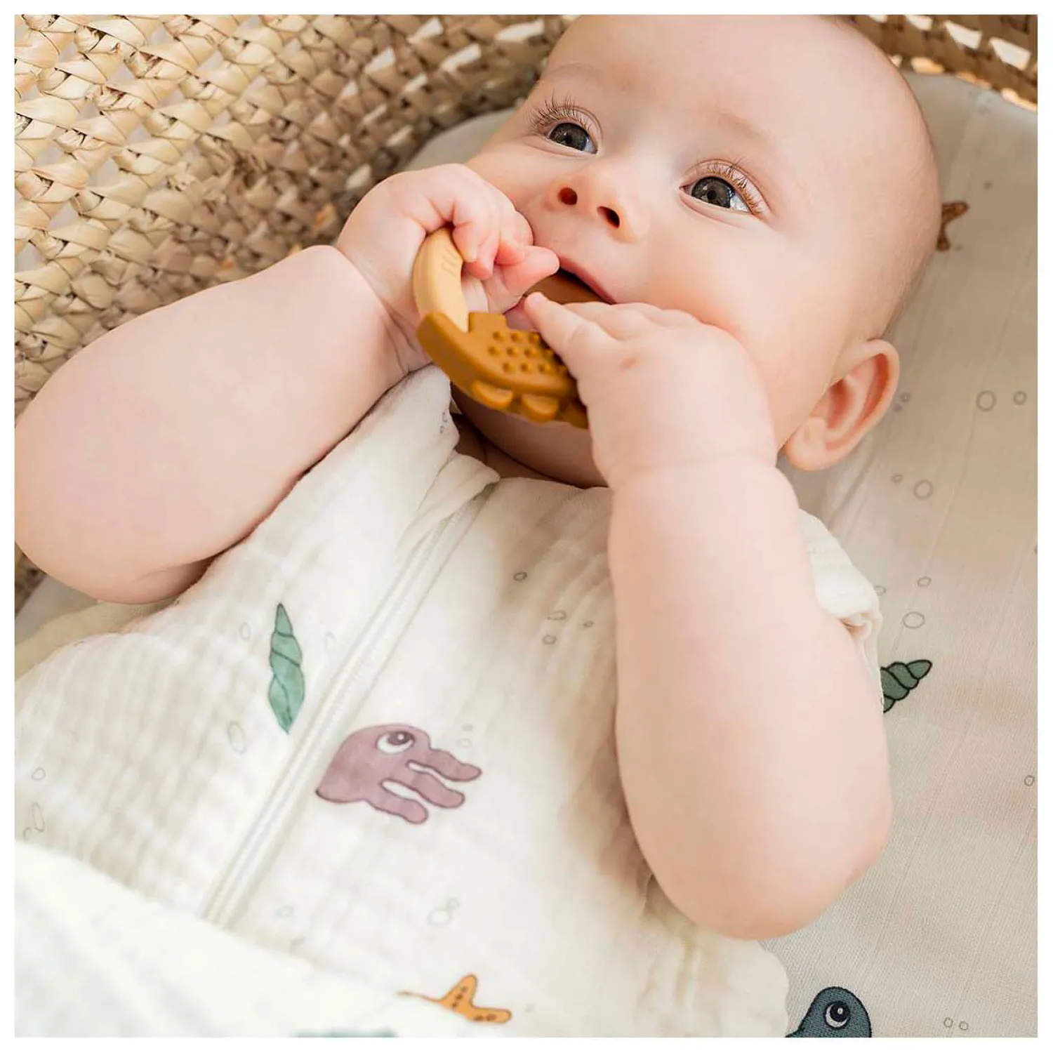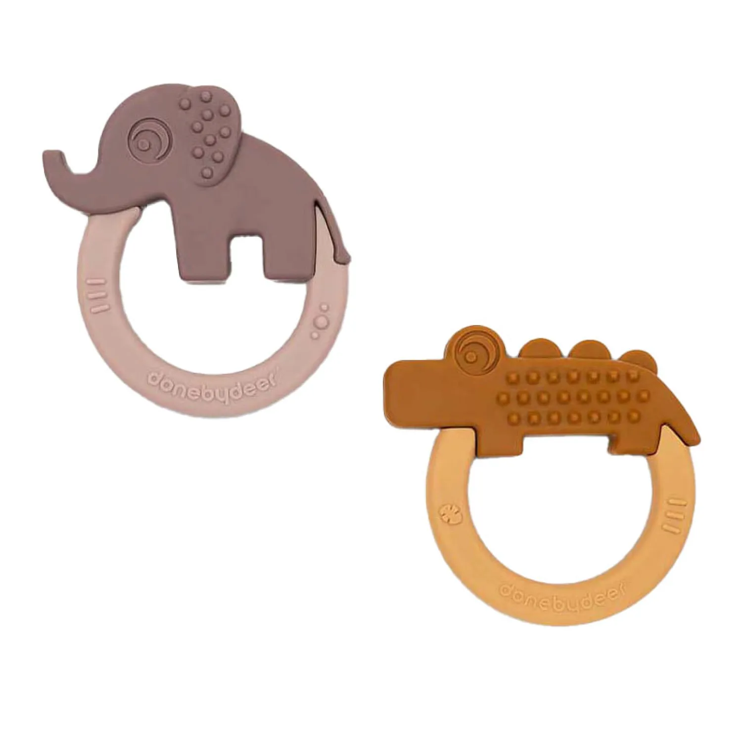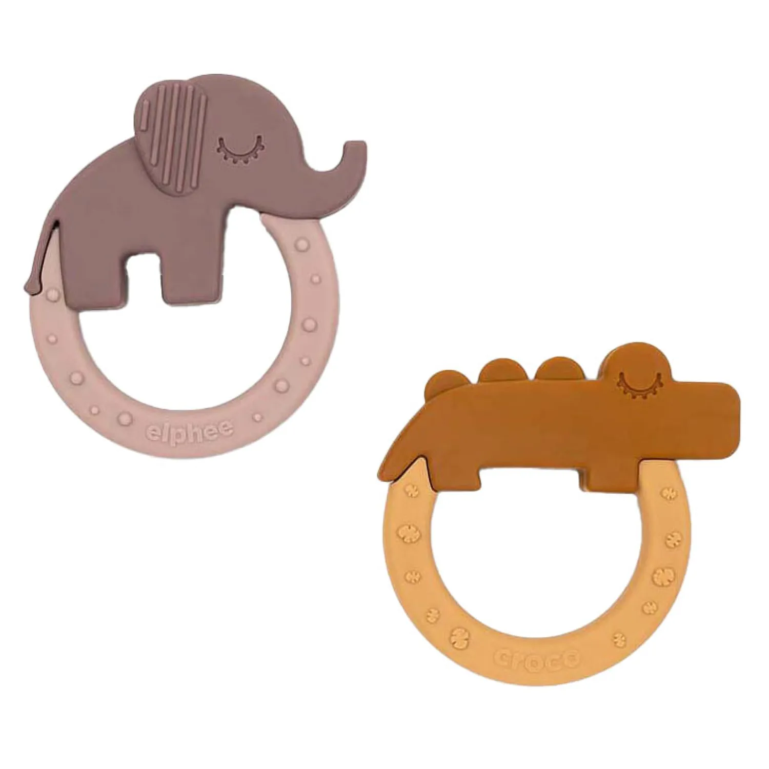 De bijtset is zo ontworpen dat hij zelfs in het kleinste handje past en stimuleert zowel de visuele, orale als tactiele zintuigen van de baby. De zachte poeder- en mosterdtinten, leuke texturen en de schattige olifant en leuke krokodil maken deze set tot het perfecte eerste speeltje.