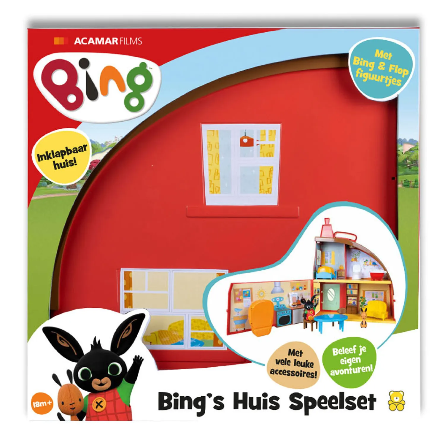 Bing’s Huis Speelset staat garant voor uren speelplezier! Open Bing’s huis en ontdek de twee verdiepingen met allerlei leuke accessoires voor verschillende speelmogelijkheden. Elke kamer heeft een thema om allerlei rollenspellen te spelen met Bing en Flop! Speel met je eigen fantasie alle avonturen na van Bing en zijn vriendjes. Maak wat lekkers in de keuken en zet Bing en Flop aan tafel om te eten. Of laat Bing lekker badderen, kijk eens hoeveel schuim er in zijn bad zit! In zijn slaapkamer vind je Bing’s bed. Met verschillende accessoires, een beweegbare Bing, een Flop figuurtje en andere interactieve elementen. Bing’s Huis is inklapbaar zodat je het eenvoudig kunt opbergen. Afmeting huis: 34x13x3413 cm (lxbxh ingeklapt). Afmeting verpakking: 35x14x35 cm. (lxbxh). Leeftijdsindicatie: 18 maanden+.
