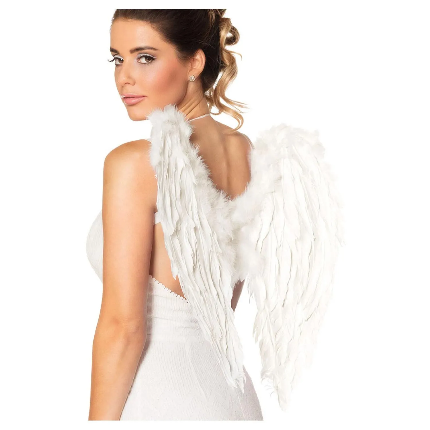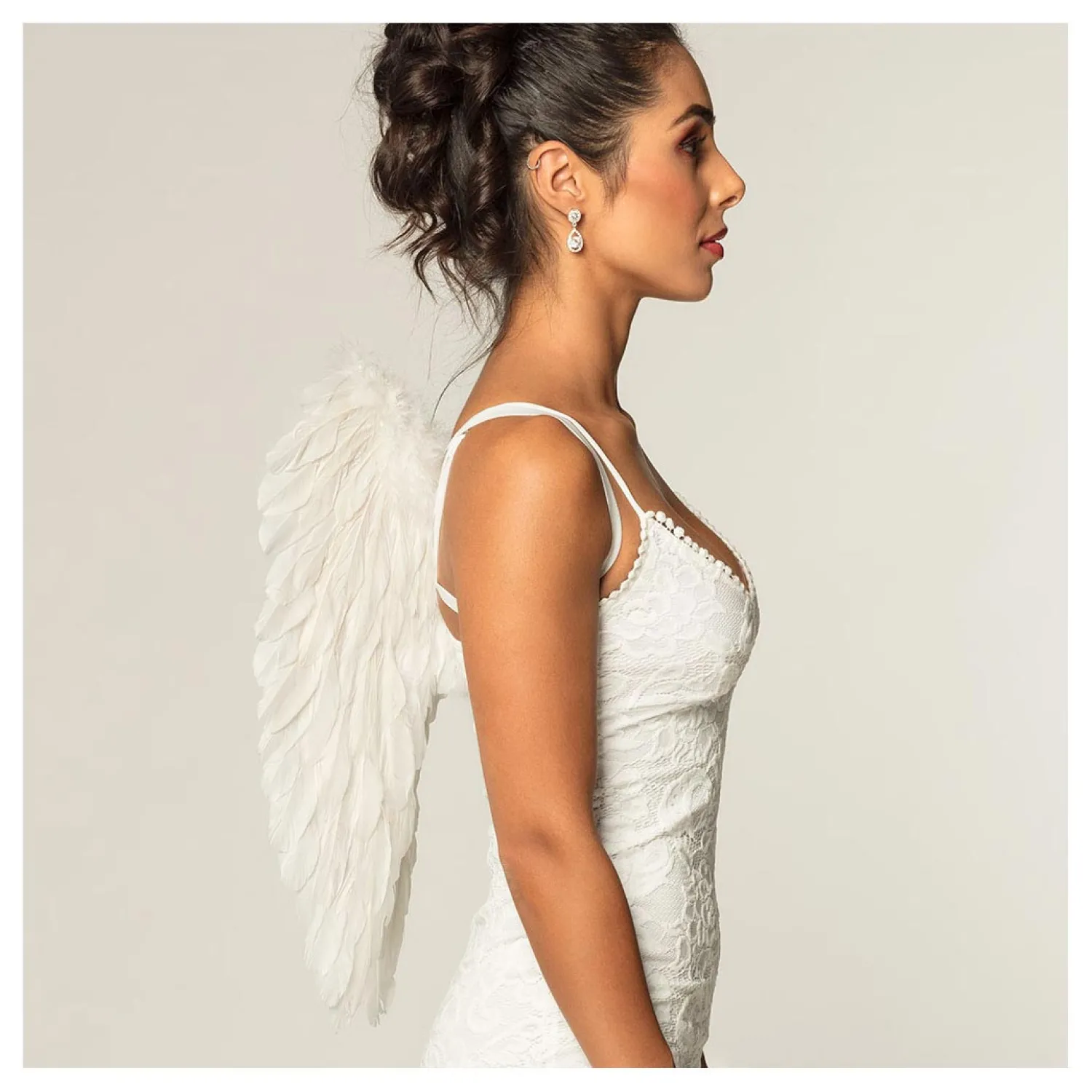 Witte engelenvleugels met veren en handige tuigjes om ze om te doen. Geschikt voor volwassenen.