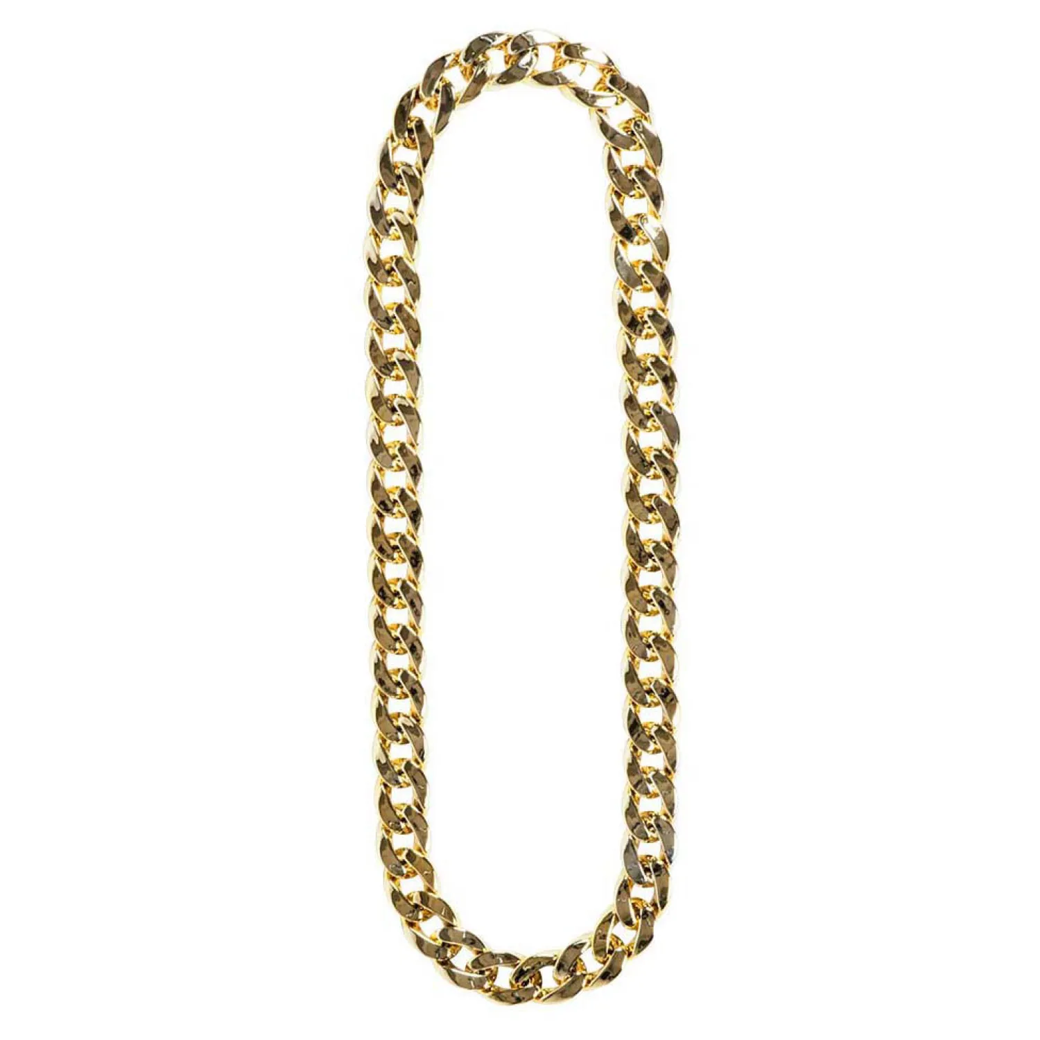 De Boland Pimp Ketting Goud is een goudkleurige schakelketting met een lengte van 45 cm. De ketting is vervaardigd uit polypropyleen, een lichtgewicht en duurzaam kunststof. Deze one-size ketting is wasbaar en ideaal voor volwassenen die zich willen hullen in de extravagante ‘pimp’-stijl tijdens themafeesten of carnaval.
