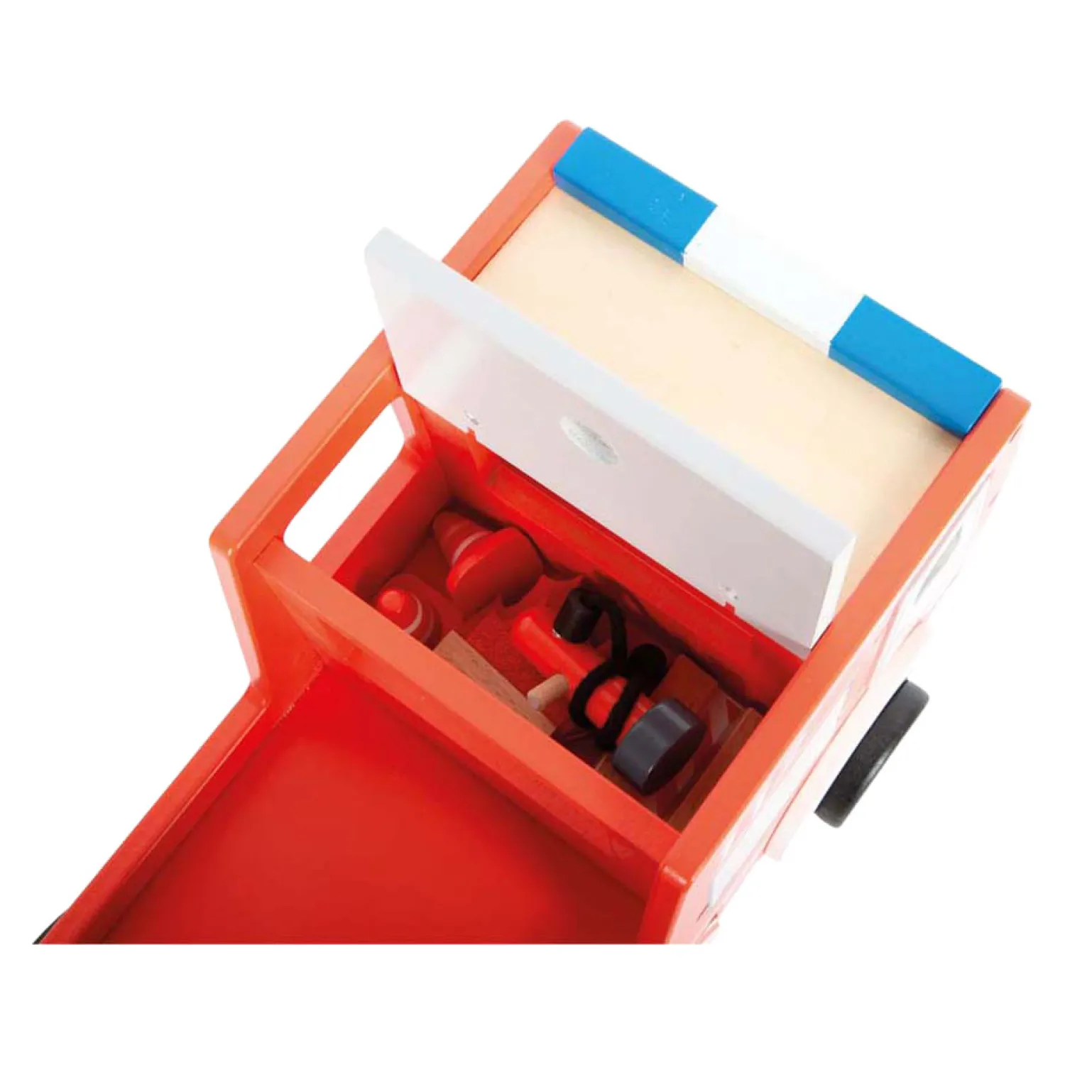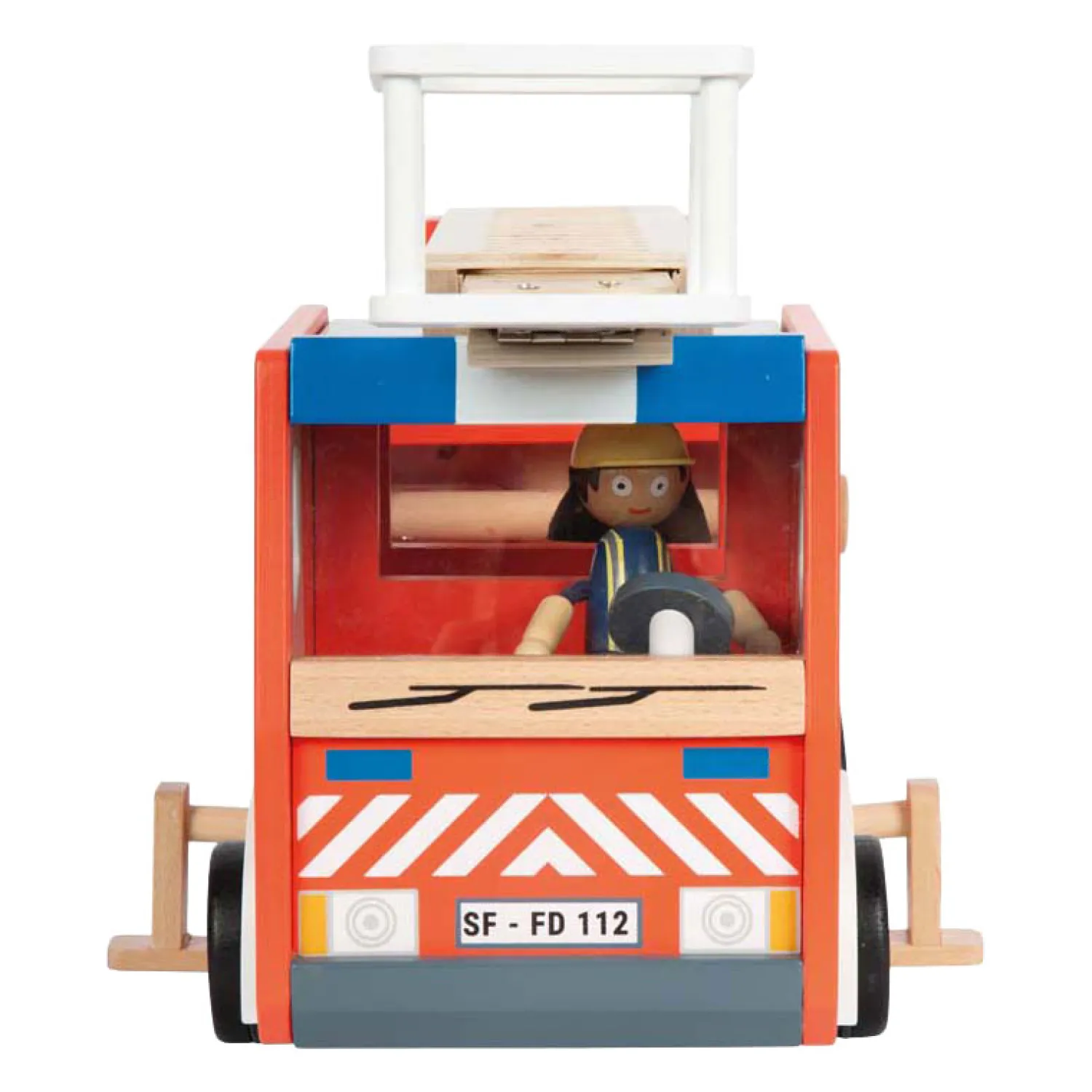•Grote houten brandweerwagen met uitschuifbare ladder en mand