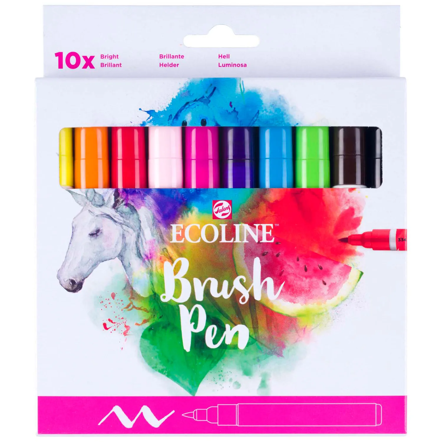 Deze set bevat 10 Ecoline Brush Pens in levendige heldere tinten. De Brush Pen kenmerkt zich door de flexibele punt en het uitgebreide assortiment schitterende kleuren dankzij de pure formule op kleurstofbasis. De transparante kleuren bieden de beste resultaten bij gebruik op wit of zeer lichtgekleurd papier. Indien gewenst kun je de kleurintensiteit gemakkelijk verminderen door ze te verdunnen met water of met de Brush Pen blender (apart verkrijgbaar). Deze pennen zijn perfect voor handlettering, aquareltekeningen, snelle schetsen en finishing touches.