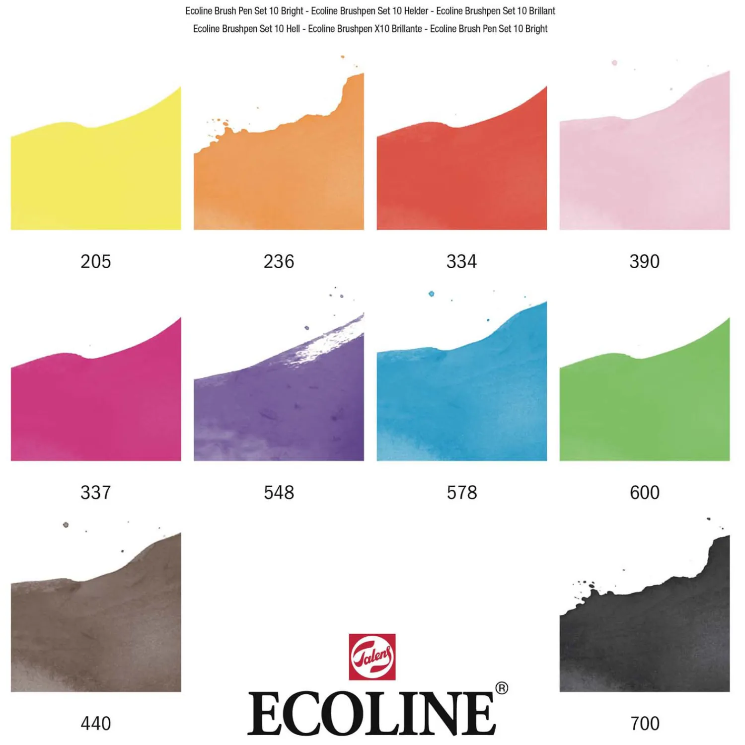 Inhoud: 10 Brush Pens (205 Citroengeel (Primair) – 236 Lichtoranje – 334 Scharlaken – 390 Pastelroze – 337 Magenta – 548 Blauwviolet – 578 Hemelsblauw (Cyaan) – 600 Groen – 440 Sepia Donker – 700 Zwart).