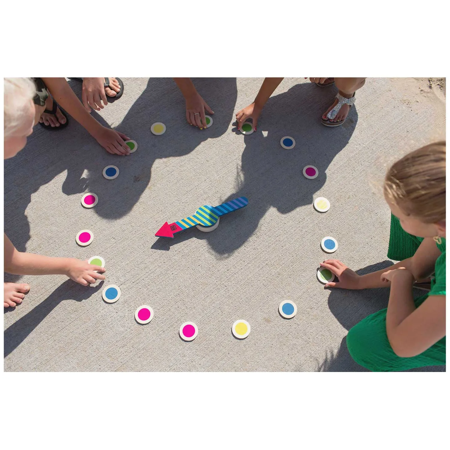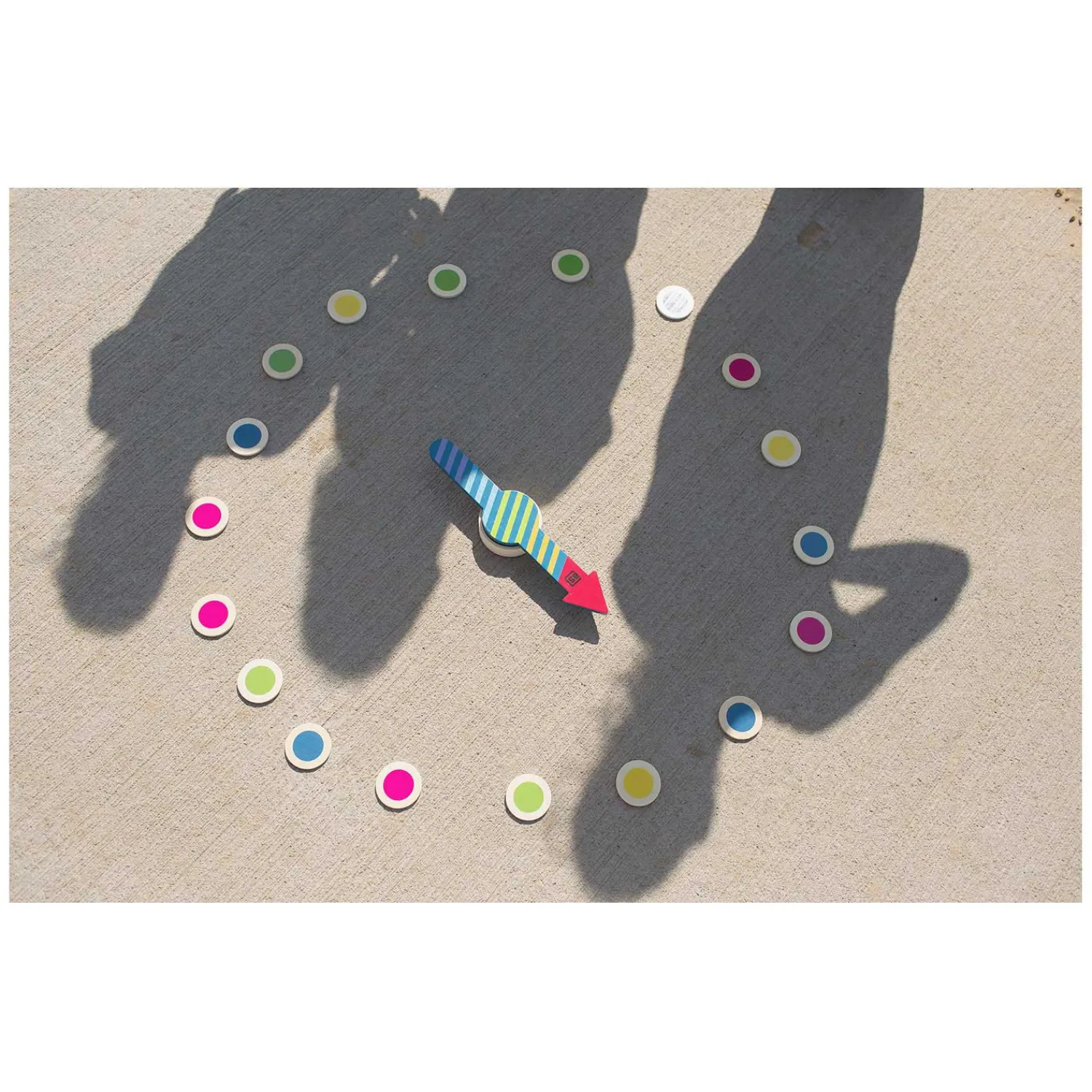 •Spel 4: Leg alle gekleurde chips in een cirkel rondom de pijl. Geef iedere kleur een actie, zoals springen, squatten of hinkelen. Draai aan de pijl en doe allemaal de bijhorende actie. Eén speler draait intussen aan de pijl. Blijf de actie doen, totdat de pijl op een andere kleur stopt en laat dan iemand anders de pijl draaien.