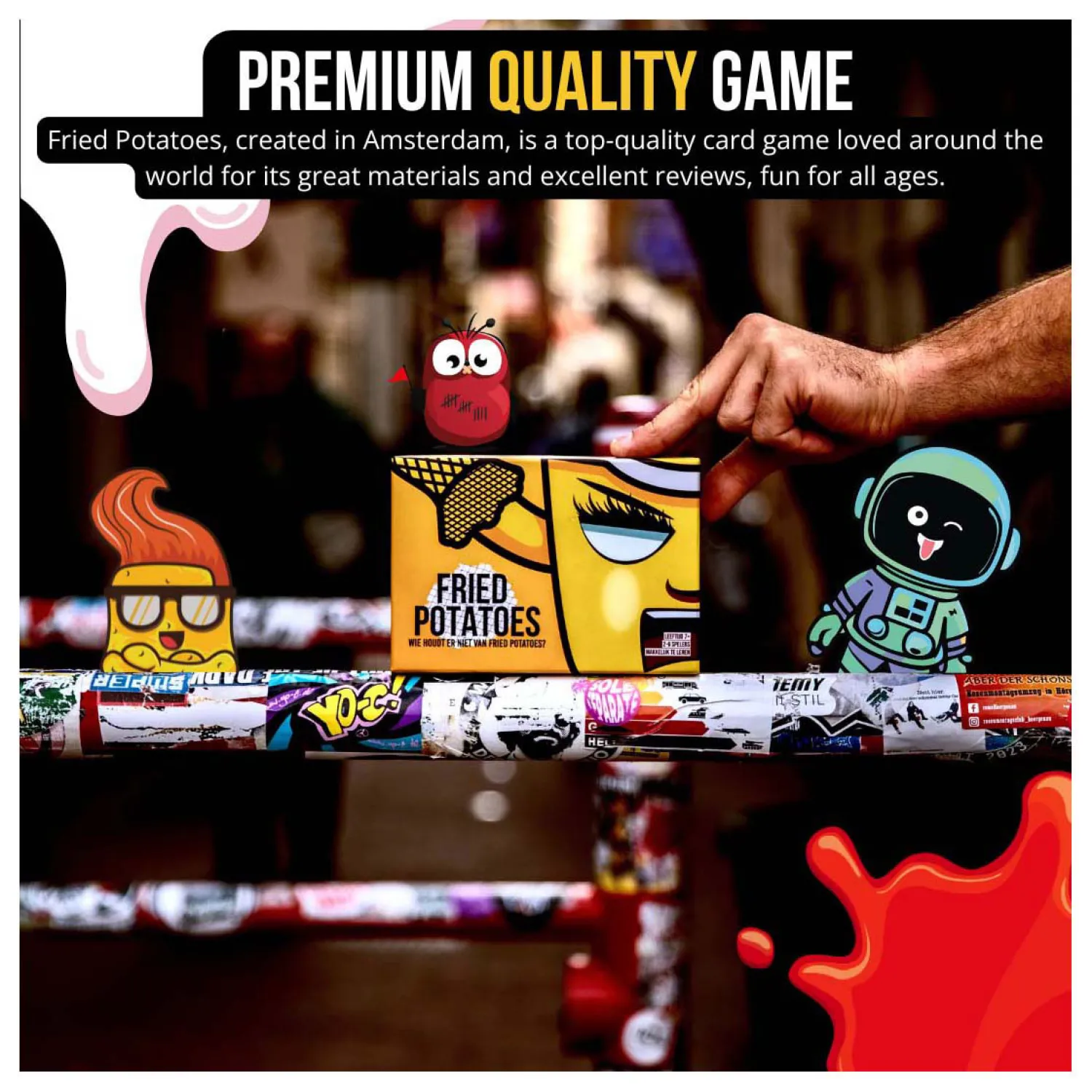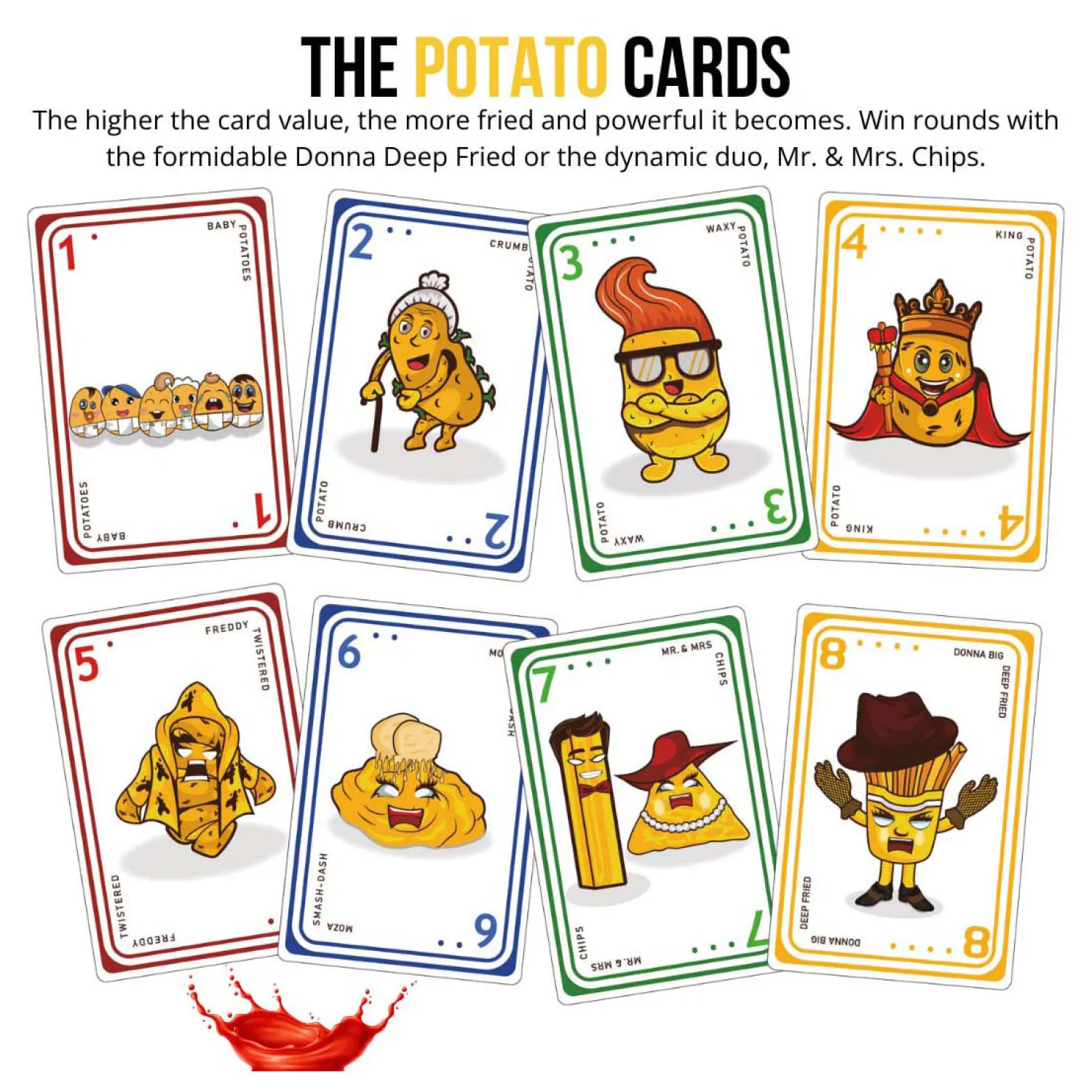 Het doel van Fried Potatoes is om je tegenstanders te frituren en het langste op het bord te overleven. Fried Potatoes is een grappig, snel slagen- kaartspel voor 2-6 spelers waar je net zo verslaafd aan zult raken als aan … Fried Potatoes! Elke ronde worden er strafpunten gegeven, en met elk stukje strafpunt kom je dichter bij de laatste ‘Fried’ tegel. Met elke gewonnen ronde kom je dichter bij de ultieme overwinning, maar pas op! De specialiteitskaarten kunnen de situatie in een oogwenk omgooien, waardoor het spel een onvoorspelbare wending neemt die je op het puntje van je stoel houdt. Wil je winnen, gebruik dan je beste strategie, zet je pokerface op en ben iedereen te slim af.
