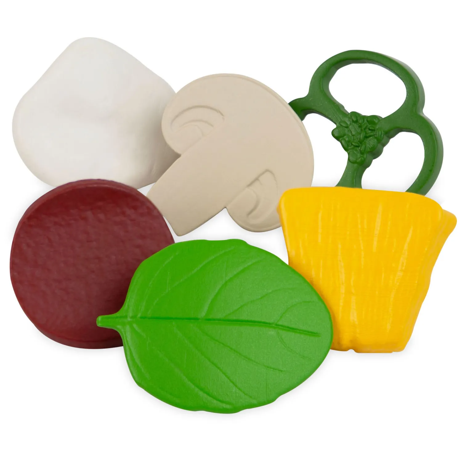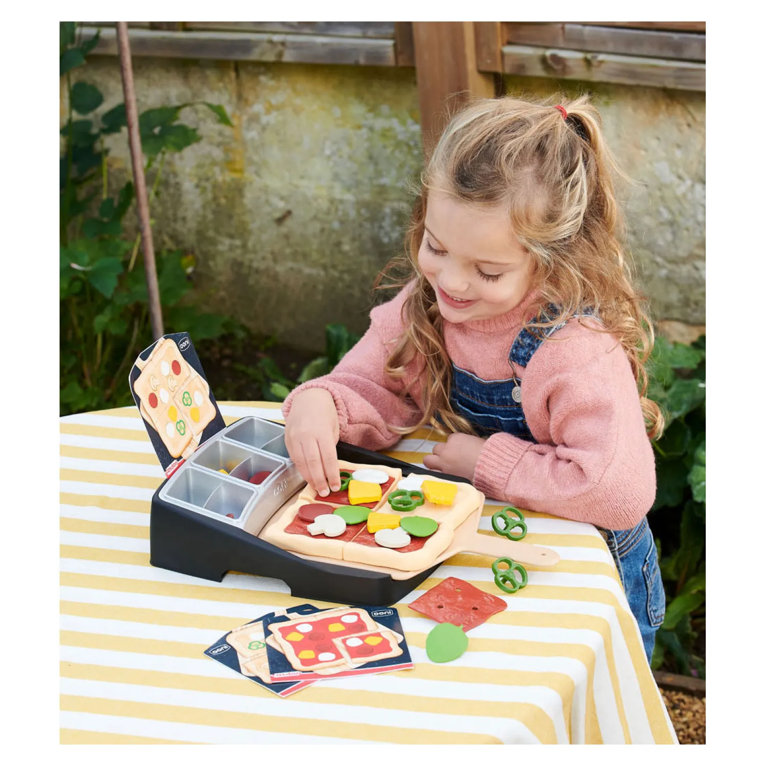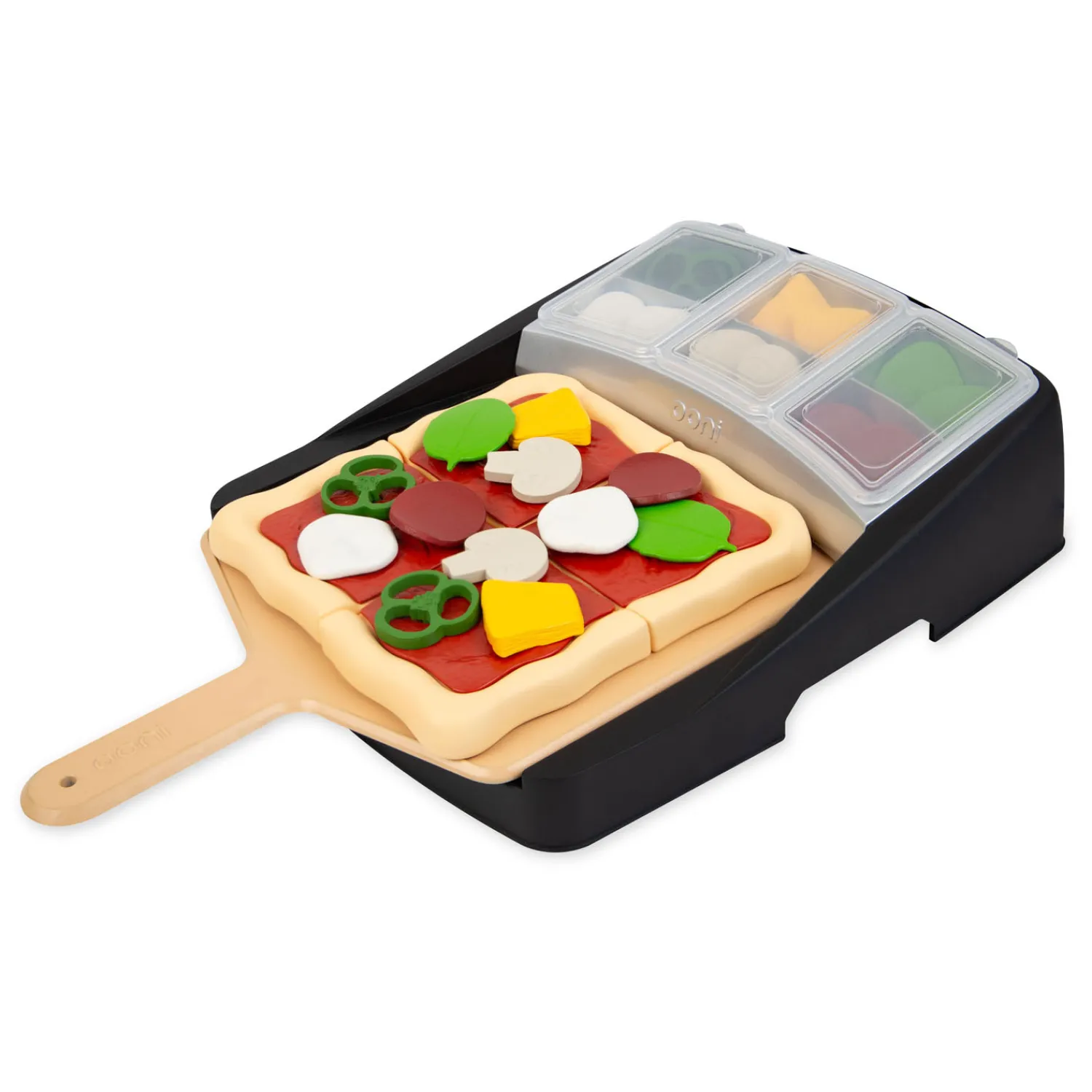 Inhoud: topping station, Ooni pizza peel, 4-delige vierkante pizza, 6x toppings: mozzarella, pepperoni, basilicum, paprika, ananas, champignons (4 van elk), 4 stukjes verwijderbare sauslagen, 3x receptkaarten voor pizza-topping.