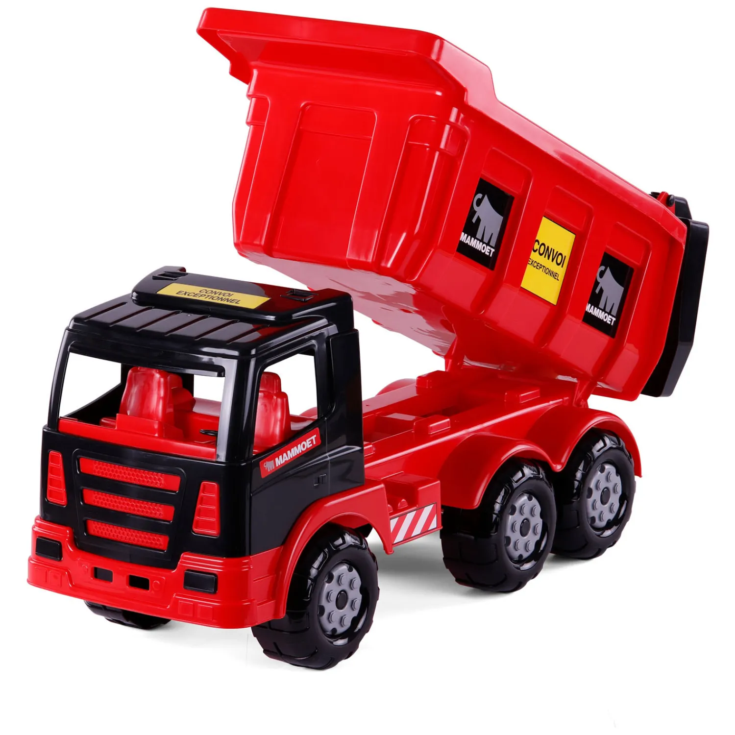 Cavallino Mammoet kiepvrachtwagen met kiepfunctie en een extra kieplade om je lading te lossen. De vrachtwagen is gemaakt van kunststof en heeft een lengte van 67 centimeter.