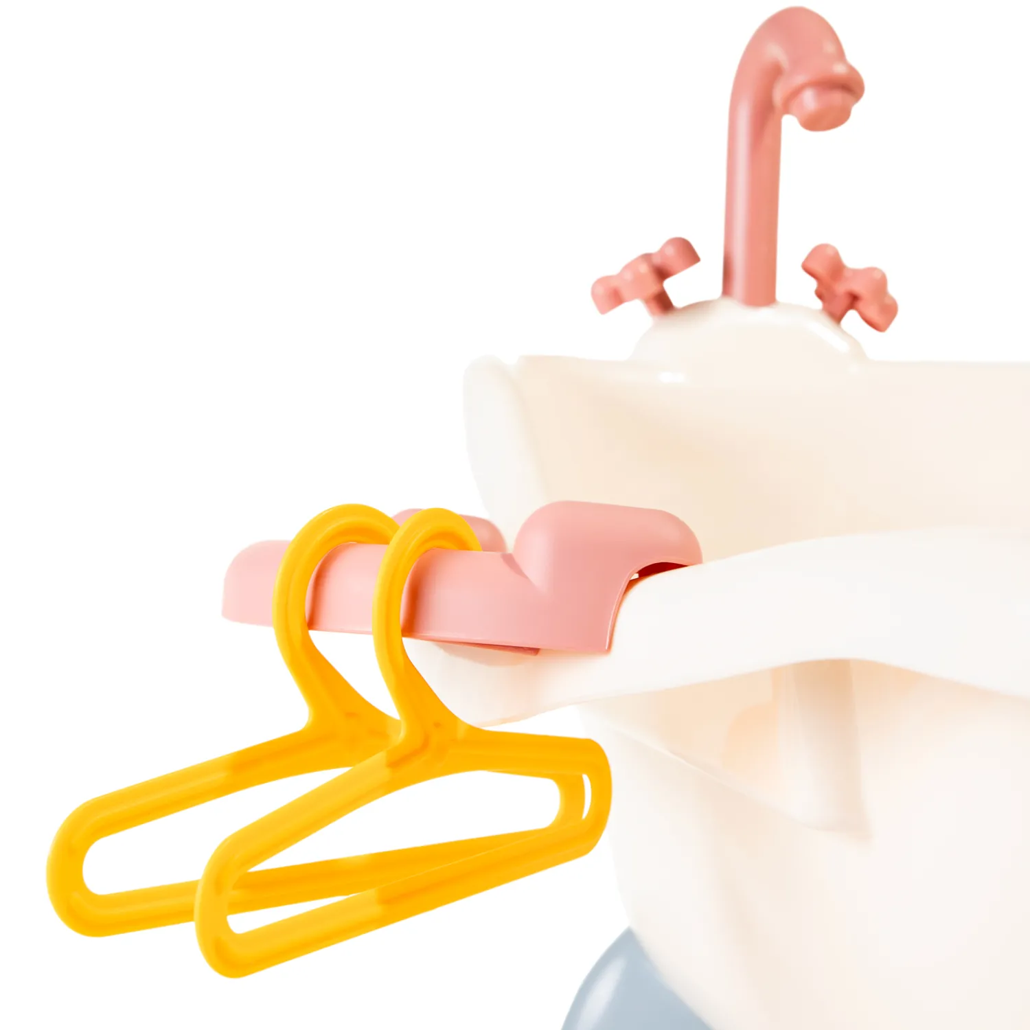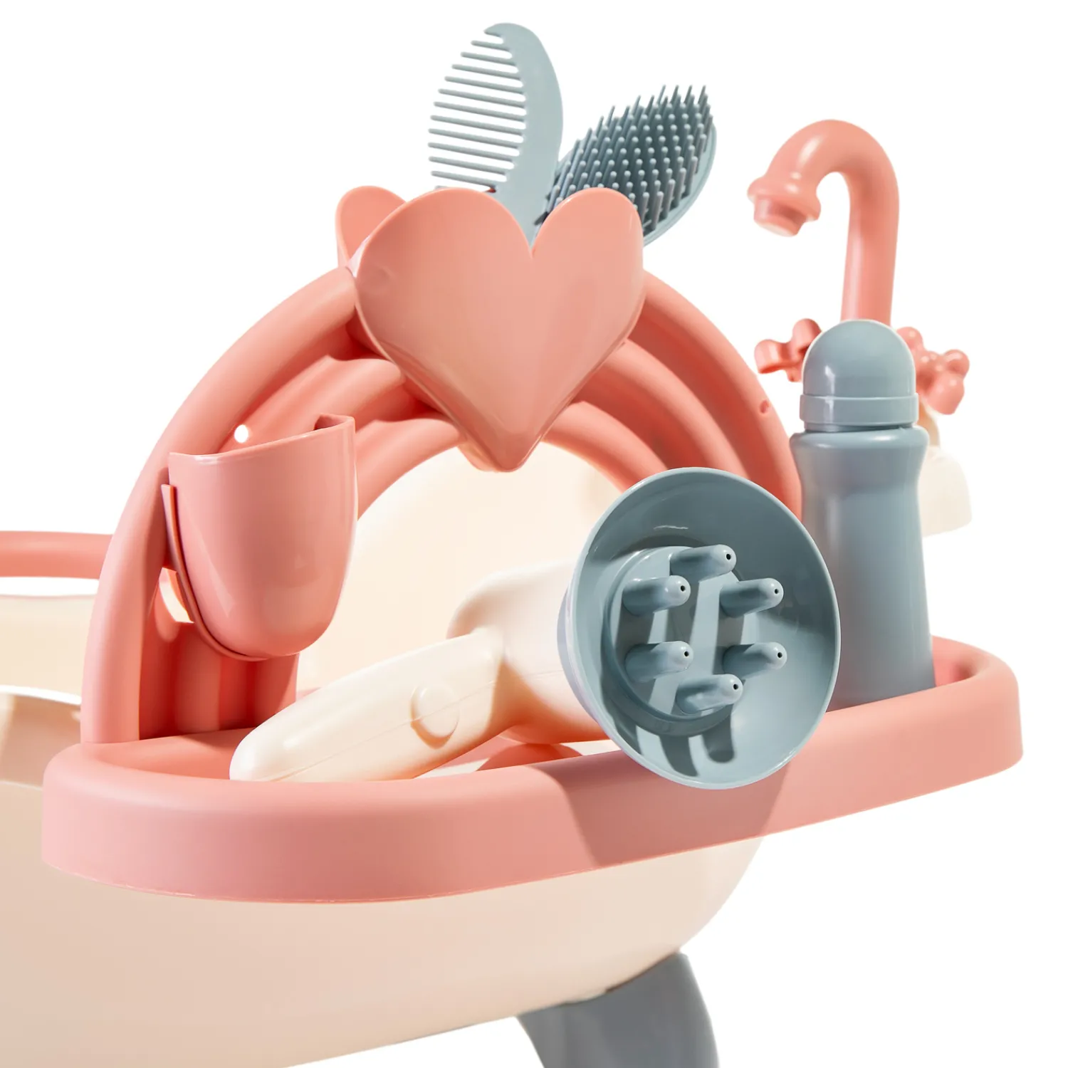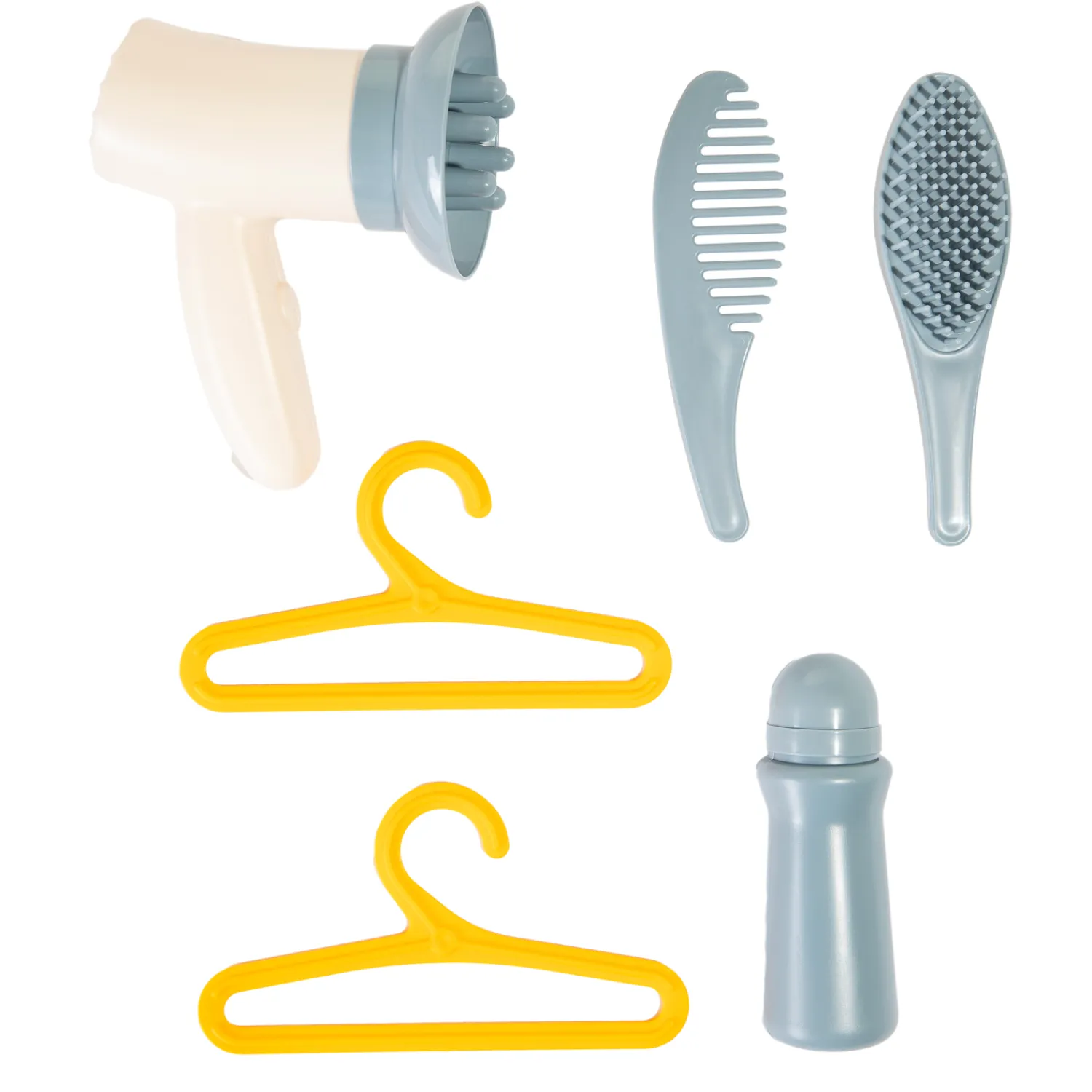 De set is gemaakt van kunststof en bevat een bad, 2 kleerhangers, een föhn, een borstel en een kam. Exclusief pop en kleertjes.