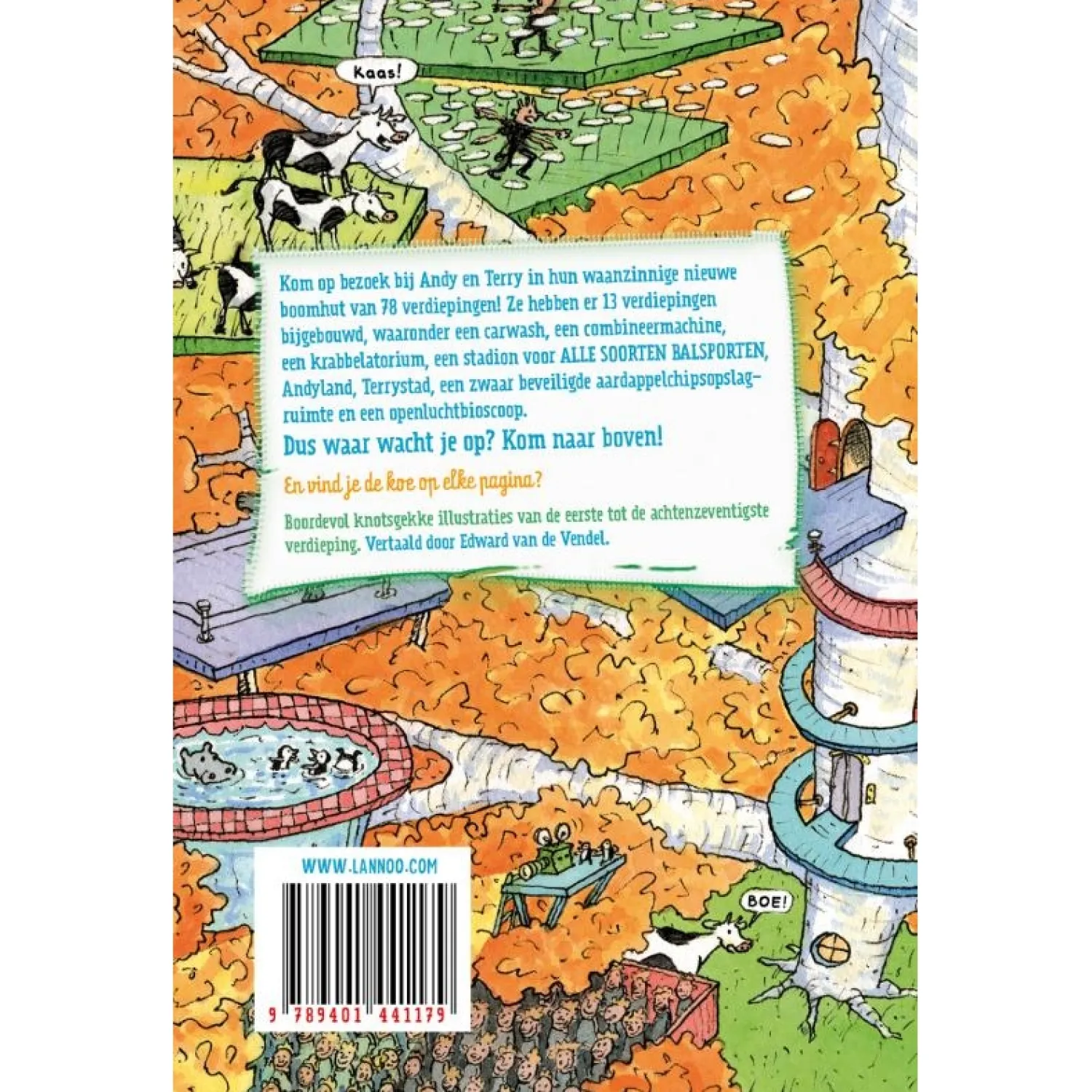 ?Kom op bezoek bij Andy en Terry in hun waanzinnige nieuwe boomhut van 78 verdiepingen! Ze hebben er 13 verdiepingen bijgebouwd, waaronder een carwash, een combineermachine, een krabbelatorium, een stadion voor ALLE SOORTEN BALSPORTEN, Andyland, Terryland, een zwaar beveiligde aardappelchipsopslagruimte en een openluchtbioscoop.Dus waar wacht je op? Kom naar boven!En vind je de koe op elke pagina?Boordevol knotsgekke illustraties van de eerste tot de achtenzeventigste verdieping.