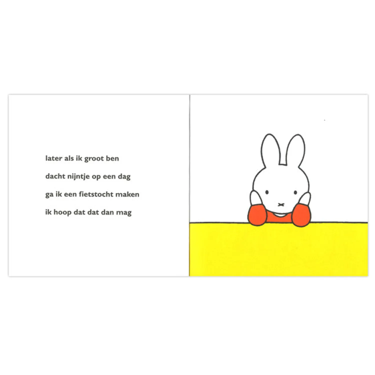 Nijntje droomt ervan ooit een fiets te hebben en dan door de bossen en over de heuvels te rijden en haar fiets schoon te maken na een regenbui.