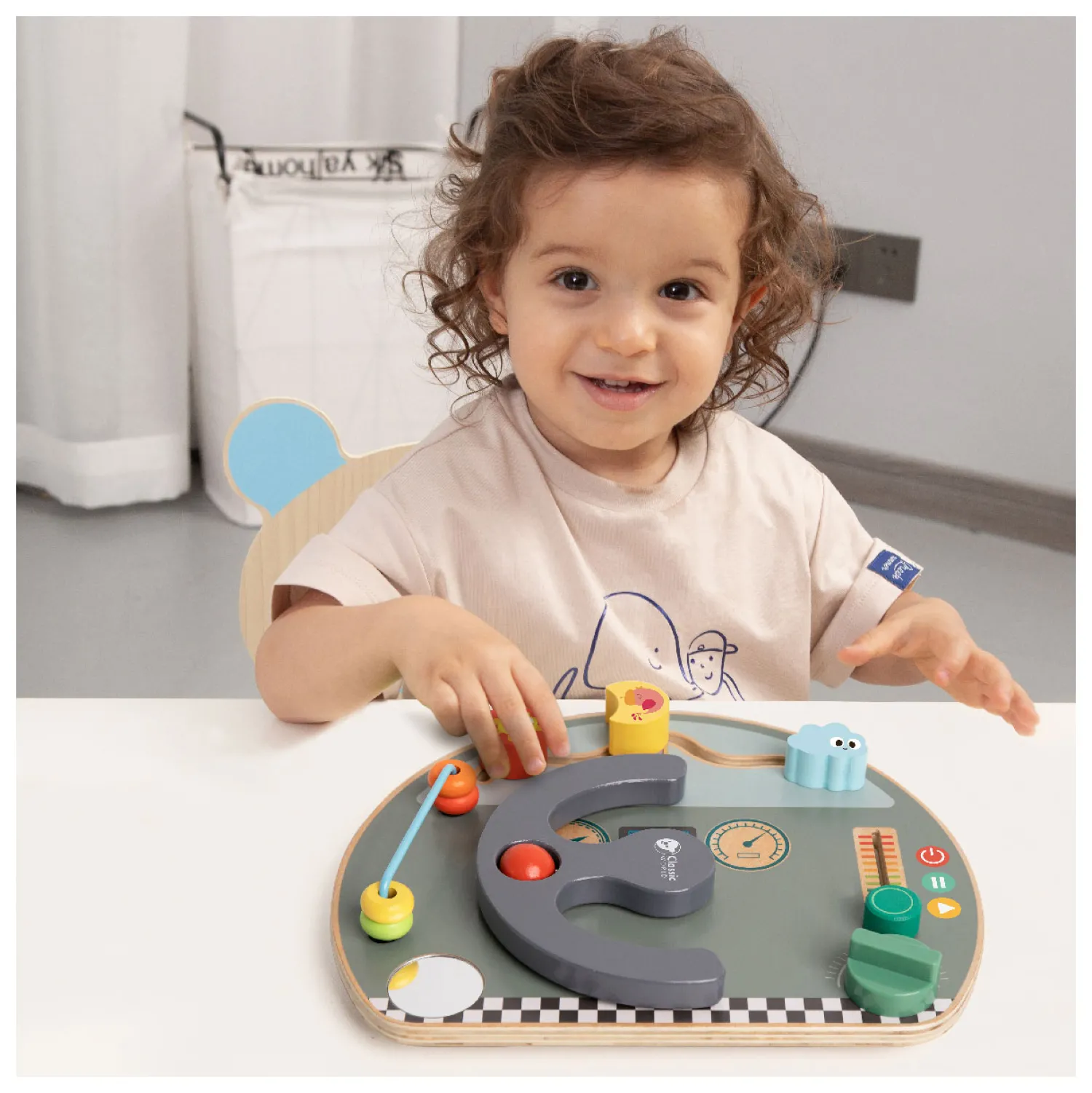 • Met o.a. schuifknoppen, draaiknop, beweegbaar stuur en kralenbaan