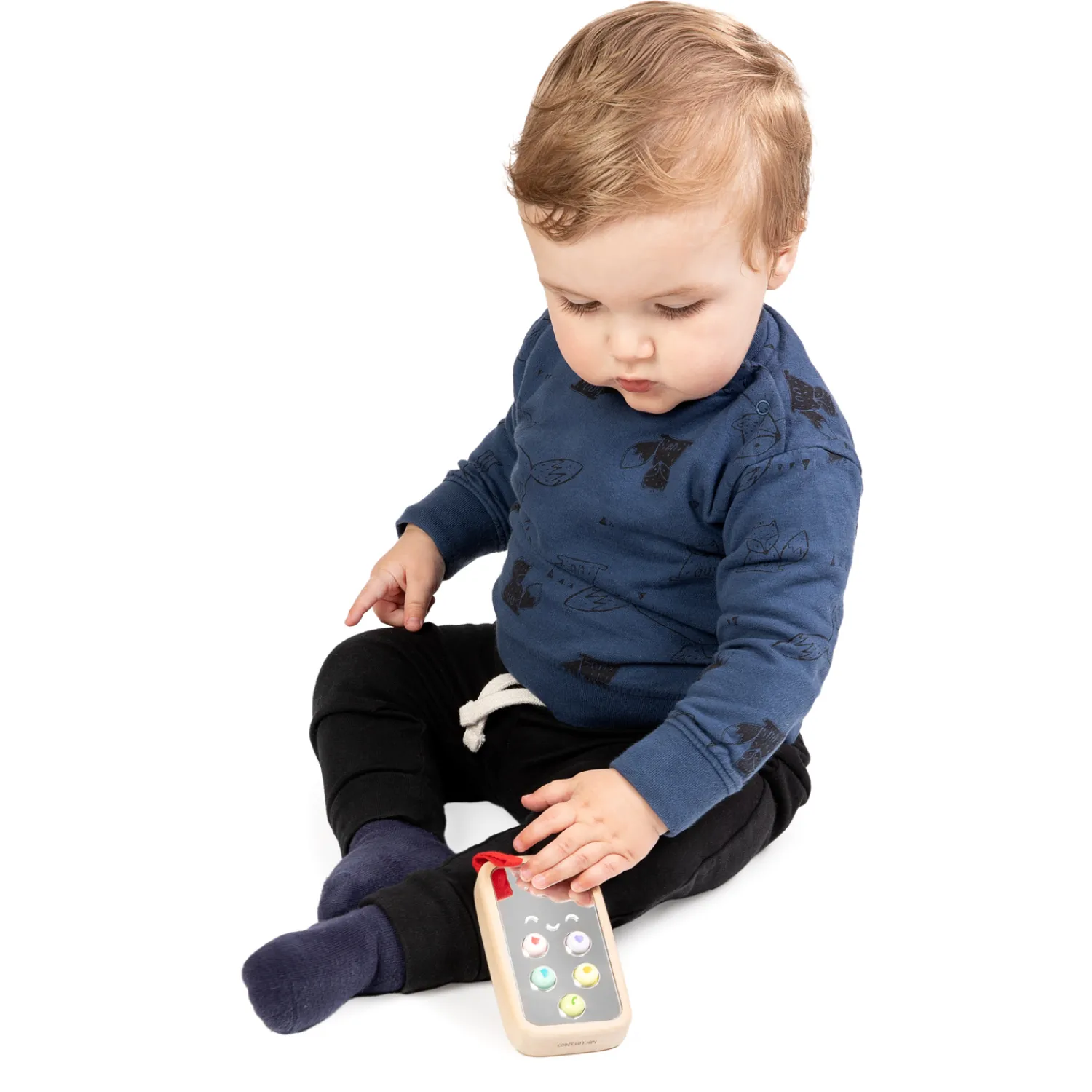 Jouw eerste eigen telefoon! Druk op de knopjes en hoor de verschillende geluidjes en muziekjes die uit de telefoon komen. De telefoon is gemaakt van hout en kunststof en heeft een touwtje aan de hoek om de telefoon vast te houden. Dit stimuleert het oefenen van de motoriek, net als de knopjes op de telefoon. Werkt op 3 LR44 batterijen (niet inbegrepen).