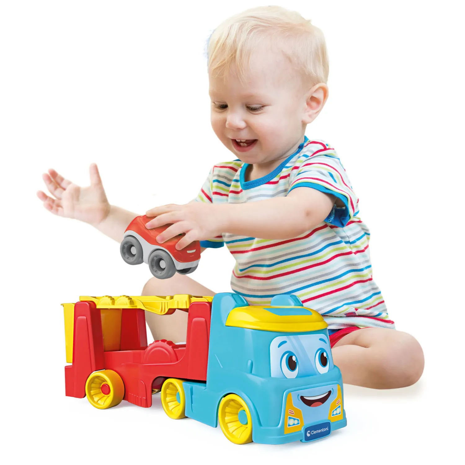 De gekleurde vrachtwagen van Baby Clementoni wordt een autotransportvoertuig om de tuimelende auto’s in te vervoeren! Het autotransportvoertuig wordt een piste om de tuimelende auto te laten racen en rollen. De auto tuimelt en maakt hele leuke koprollen en stimuleert zo de nieuwsgierigheid van het kind. Het spel stimuleert de handvaardigheid en de verbeelding van het kind, die de vrachtwagen kan gebruiken om de omgevingen van de echte wereld na te bootsen. Uitbreidbaar spel. Ontdek alle kleuren van de tuimelende auto’s! Play for future: product vervaardigd uit 100% gerecycled materiaal.Prijs per stuk, verschillende uitvoeringen/kleuren worden door elkaar geleverd.