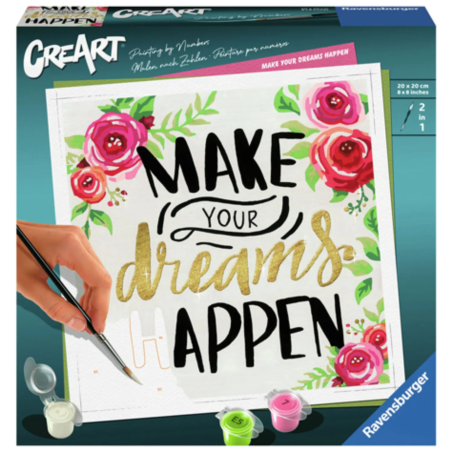 Schilderen op nummer van Ravensburger – iedereen kan schilderen! Dankzij de eenvoudige schildertechniek van schilderen op nummer is het kinderlijk eenvoudig de kunstenaar in jezelf wakker te maken! Dankzij de duidelijke schildervakjes ontstaat een klein en prachtig kunstwerk van 20,00 cm x 20,00 cm. De fijnere kleurnuanceringen zorgen voor een elegant kleurverloop en schaduwspel. Uitpakken en aan de slag, met de afbeelding van Make your dreams happen!
