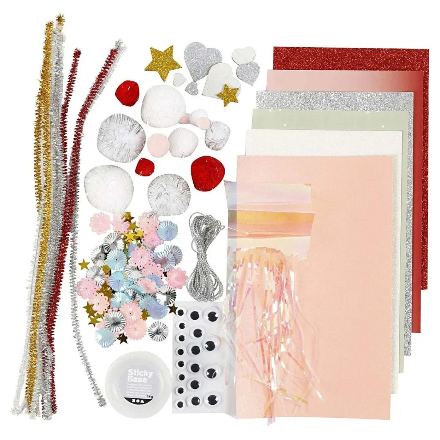 Inhoud: Sticky Base, pailletten, pom-poms, glitterpapier, bedrukt papier, metalen pijpreinigers, iriserende cellofaanlametta, zelfklevende wiebelogen, zilverkoord en figuren van EVA-schuim met glitter.