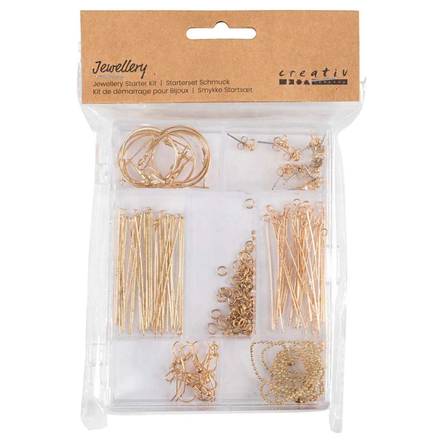 Grote set met alle sieraden die je nodig hebt om je eigen unieke sieraden te creëren.Droom je ervan je eigen sieraden te maken? Dan zijn onze startsets voor sieraden precies wat je zoekt. De set bevat de belangrijkste sieraden voor het maken van veel verschillende soorten sieraden. Ze bevat oorringen, Franse oorhaken en de klassieke oorstekers voor het maken van oorsieraden, maar ook nietstiften en jasseron in twee versies. Er is dus voldoende om uit te kiezen in deze sieraden startset..Inhoud: Franse oorbelhaken, oorstekers, oorringen, nietstiften met en zonder oog, O-ringen en jasseron