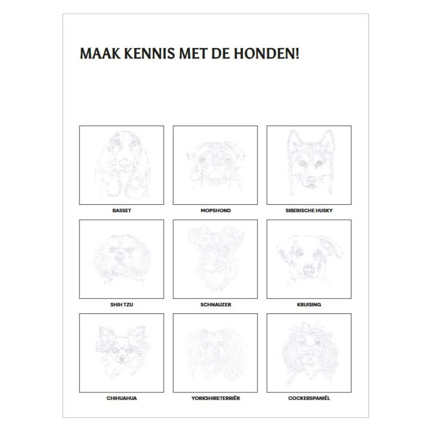 Een mopshond of een yorkshireterriër? Of toch liever een buldog of een dalmatiër? Slijp je potlood en breng je favoriete honden tot leven in deze uitdagende puzzels. Met meer dan 1000 punten zijn ze ideaal om jezelf helemaal te verliezen in je bezigheid en alle stress en zorgen veven te vergeten! Bovendien zijn de tekeningen uitscheurbaar, zodat je je creaties eenvoudig kan ophangen en bewonderen.