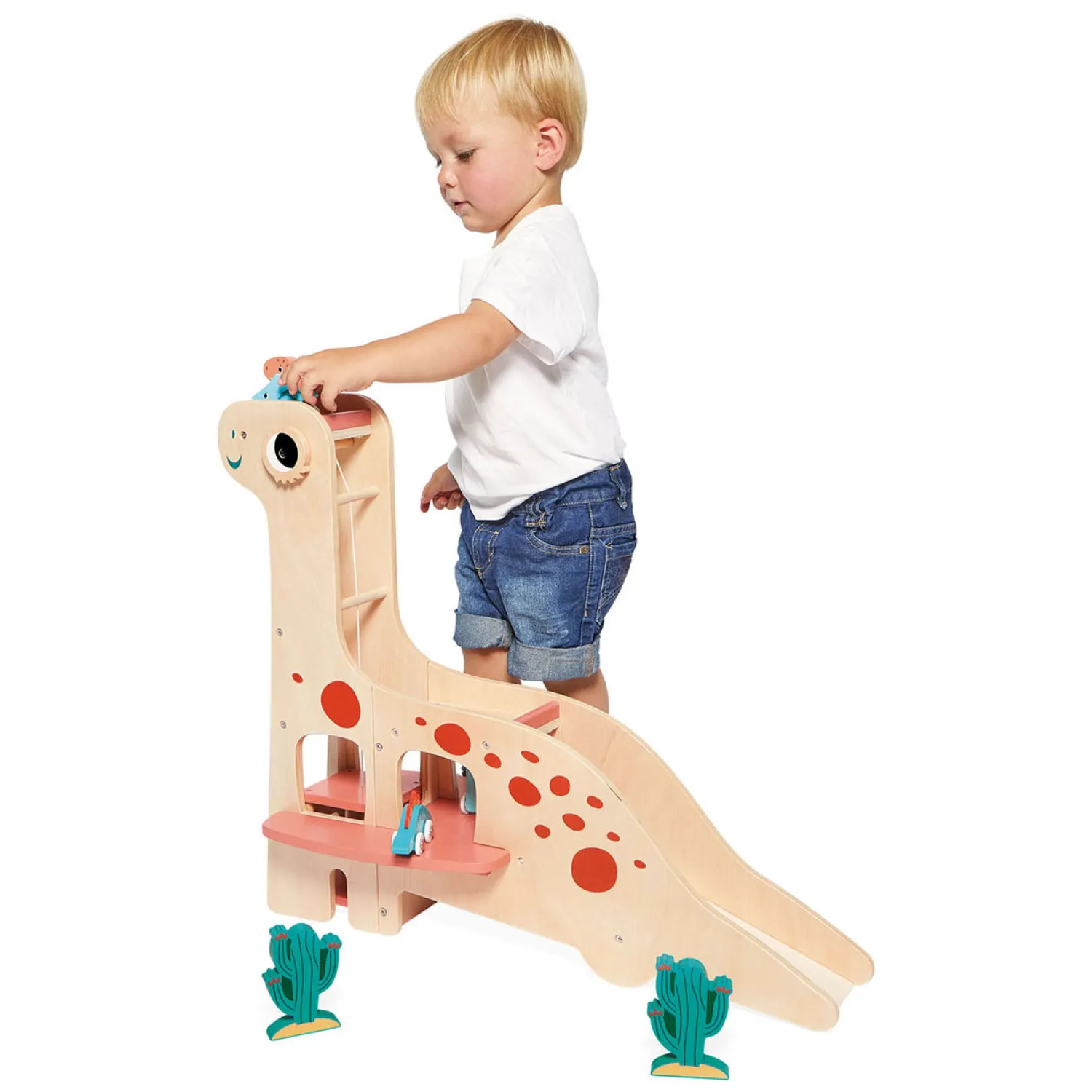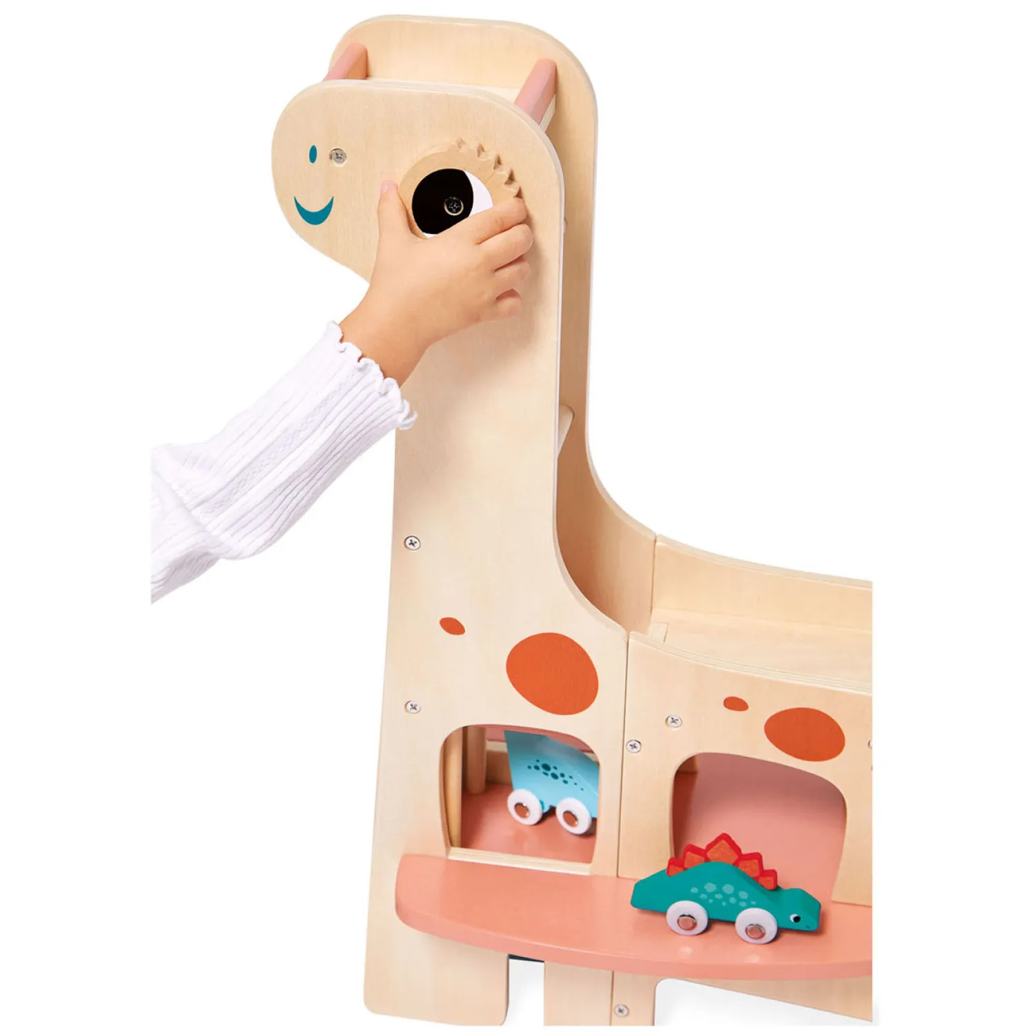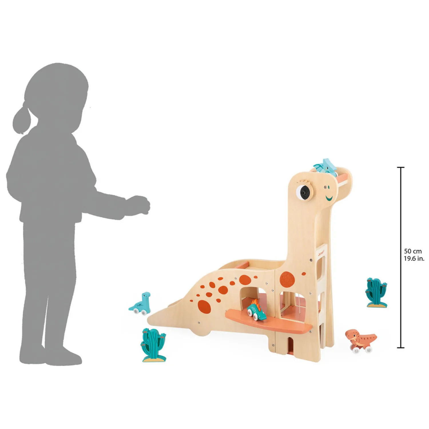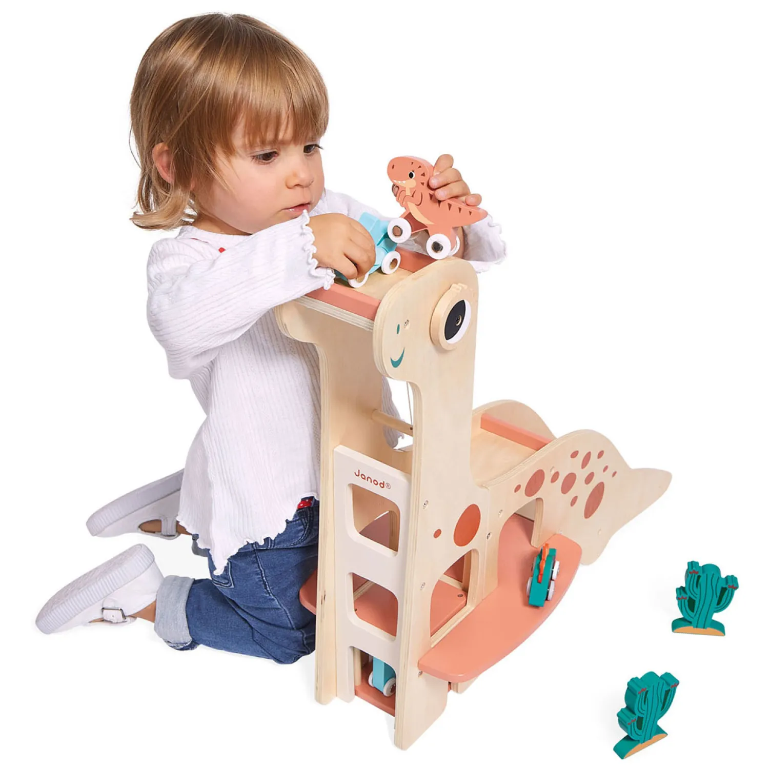 De garage is uitgerust met een lift voor een directe toegang tot de eerste en tweede verdieping. En om naar beneden te gaan? Twee mogelijkheden: een helling die als glijbaan gebruikt kan worden voor de lefgozers of de lift voor de minder grote waaghalzen. De kleine pteranodon beschikt over zijn eigen platform om direct op het dak van de garage te landen. Er zijn tevens twee cactussen meegeleverd om de omgeving te verfraaien.