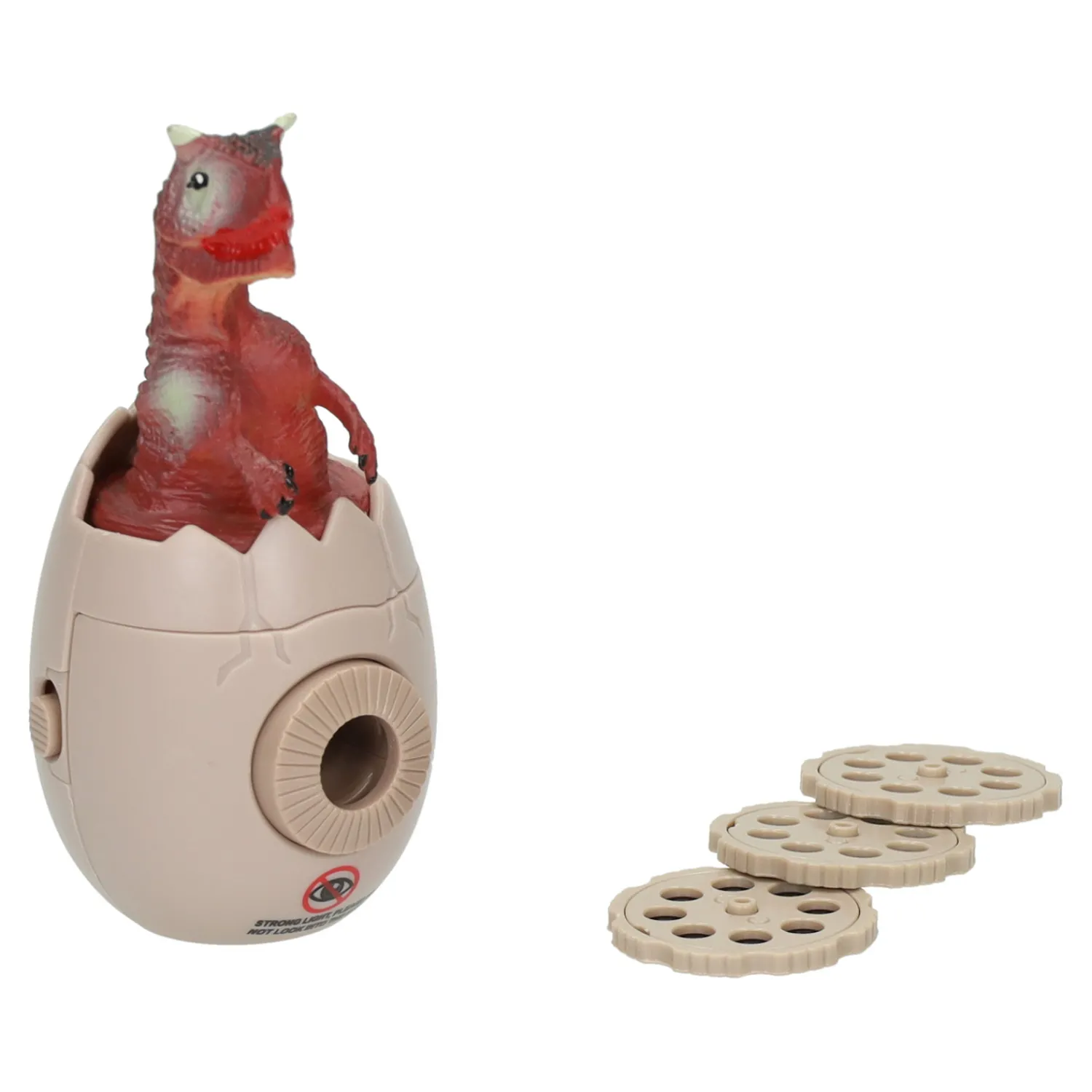 Inhoud: projector, 1 dino in ei (de projector), 3 projectie schijfjes, lus om om je hand te doen.