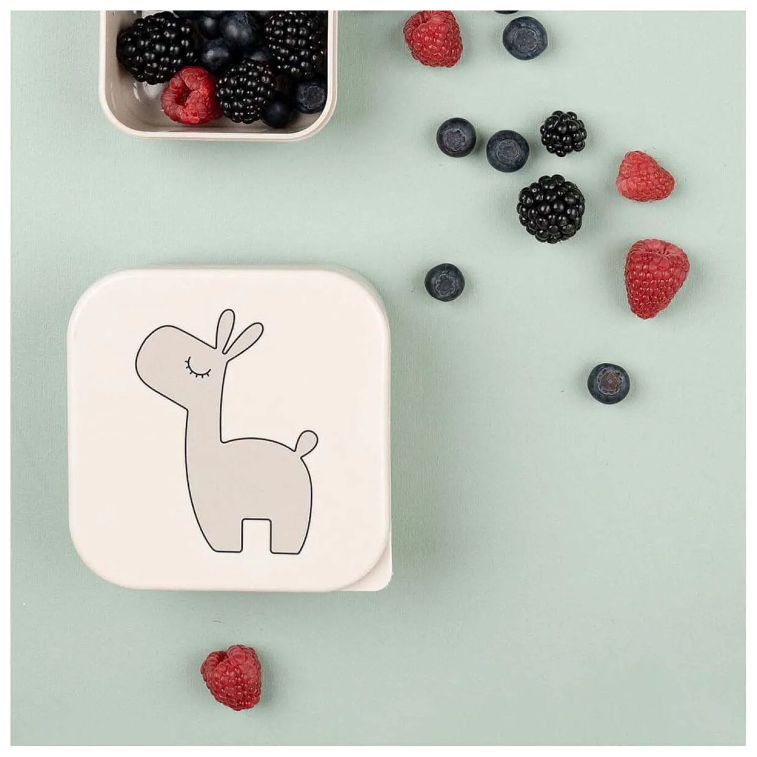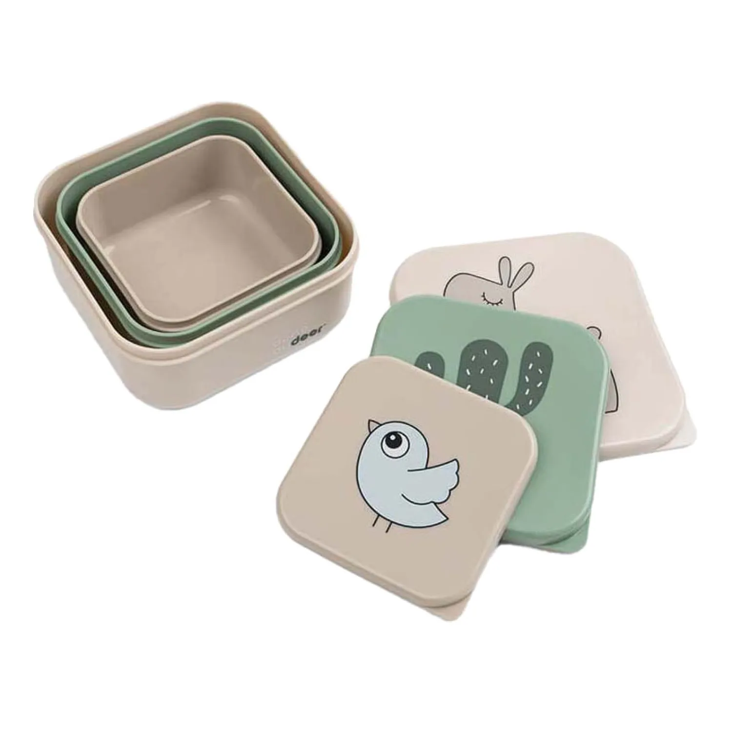 Een schattige set van drie dozen, een zandkleurige box versierd met Lalee, een groene versierd met een grote cactus en een zandkleurige box met de kleine Birdee.