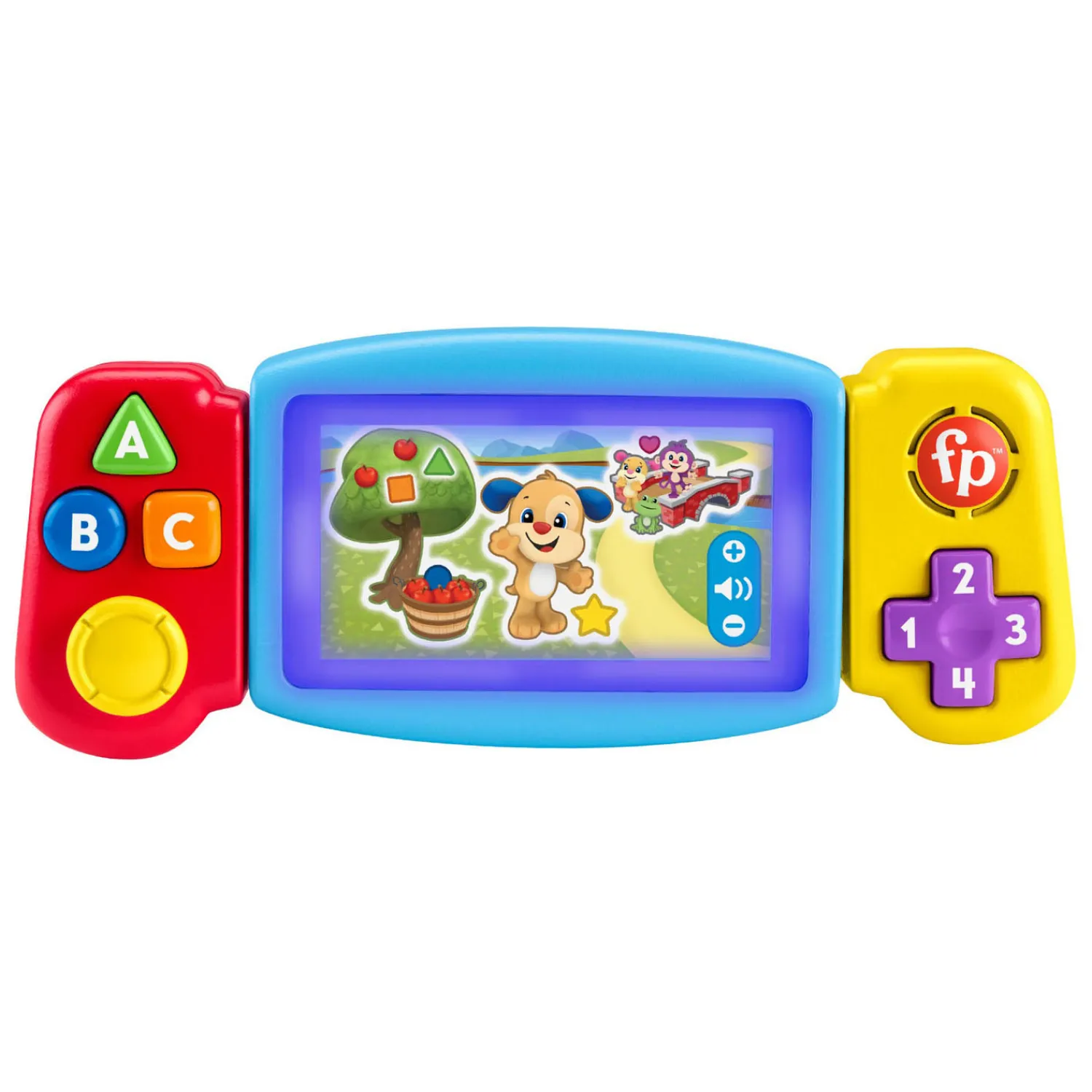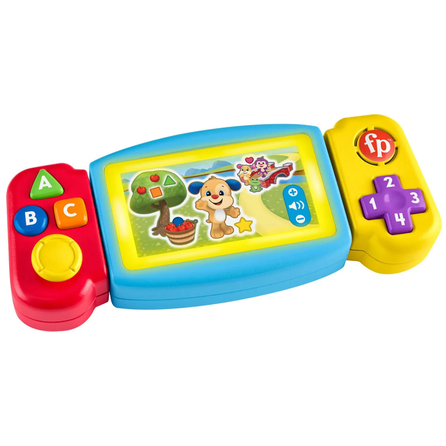 Maak het speelkwartier nóg leuker met het Leerplezier Draai en Leer Spel van Fisher-Price. Dit interactieve, leerzame speelgoed lijkt op een draagbare gameconsole voor volwassenen, maar met speciale functies voor peuters, zoals het Leerplezier-team op het scherm, 2 ‘controllers’ die kunnen draaien en schuiven, en talloze leuke knoppen om in te drukken. Wanneer de kleintjes ‘gamen’, activeren ze meerkleurige lichtjes, liedjes en leerzame zinnen waarmee ze tellen van 1 tot 10, vormen en kleuren kunnen leren. Kies een taal met de knop met een wereldbol: Nederlands, Frans, Duits, Italiaans of Engels
