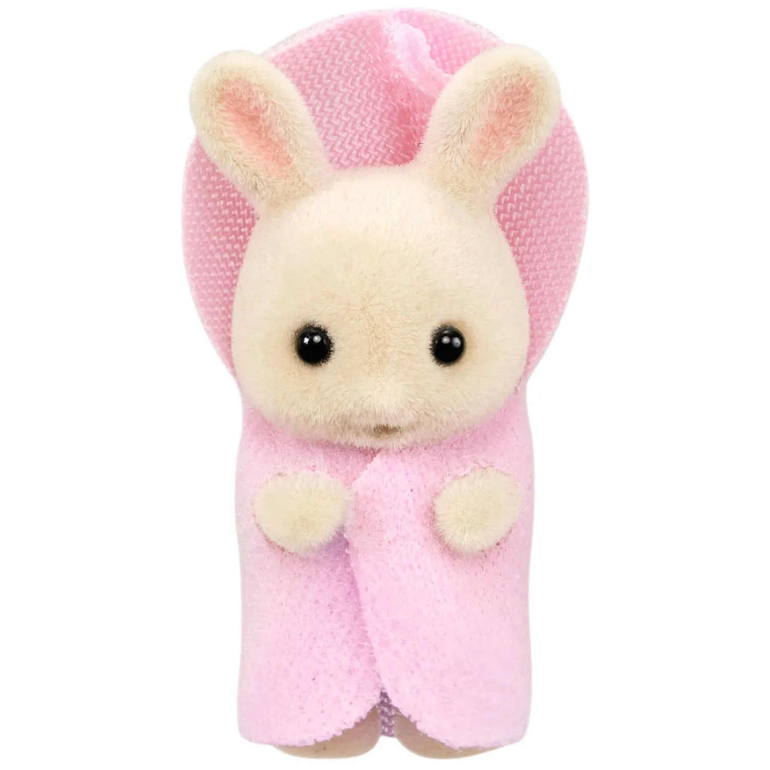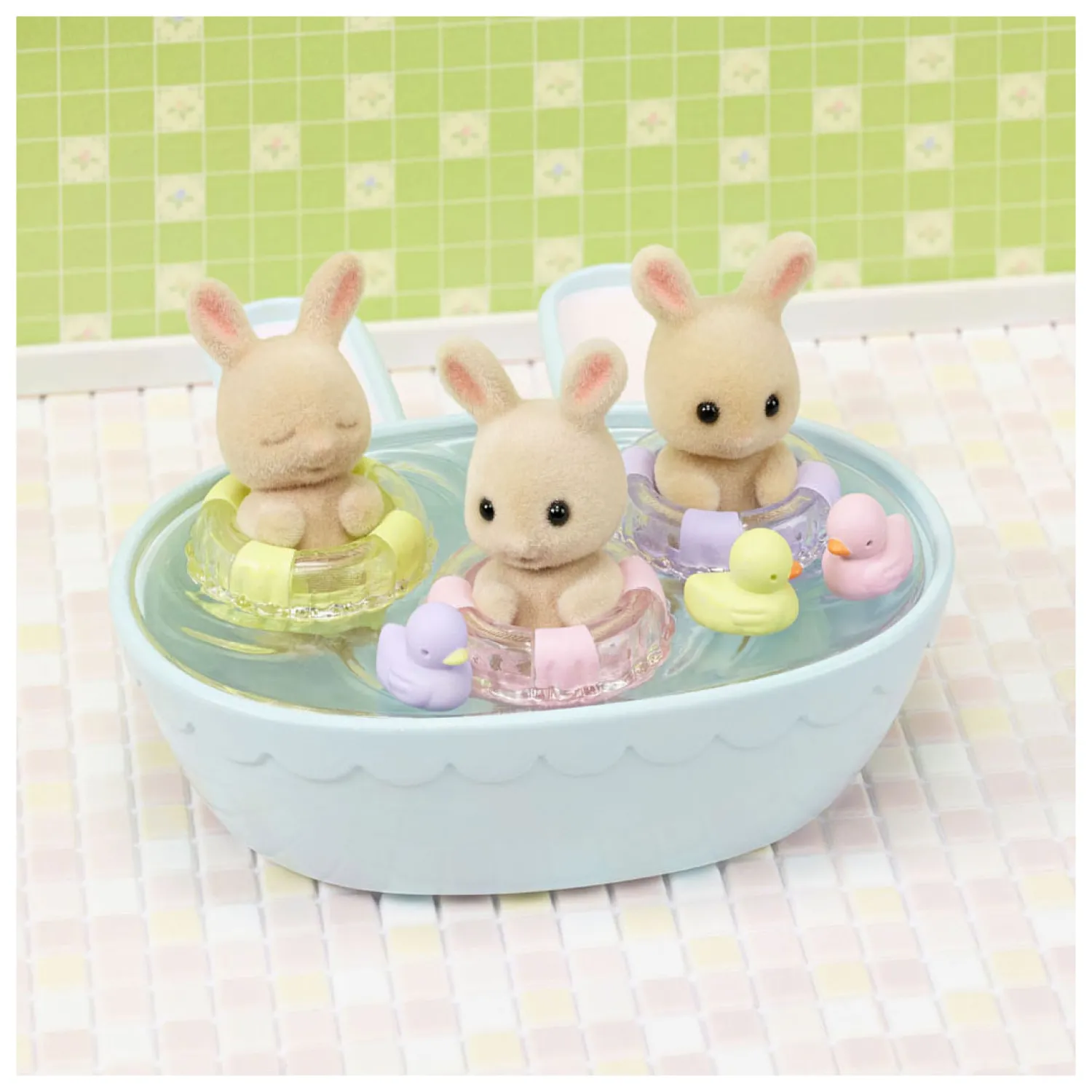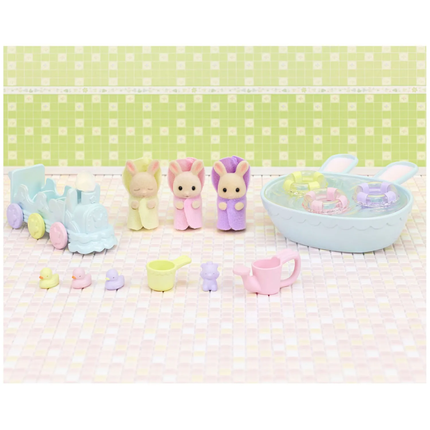De set bestaat uit de drie pasgeboren konijnendrielingen, een babybadje met op kleur afgestemde bad eendjes plus een grote speelgoedtrein waar ze allemaal op kunnen spelen.