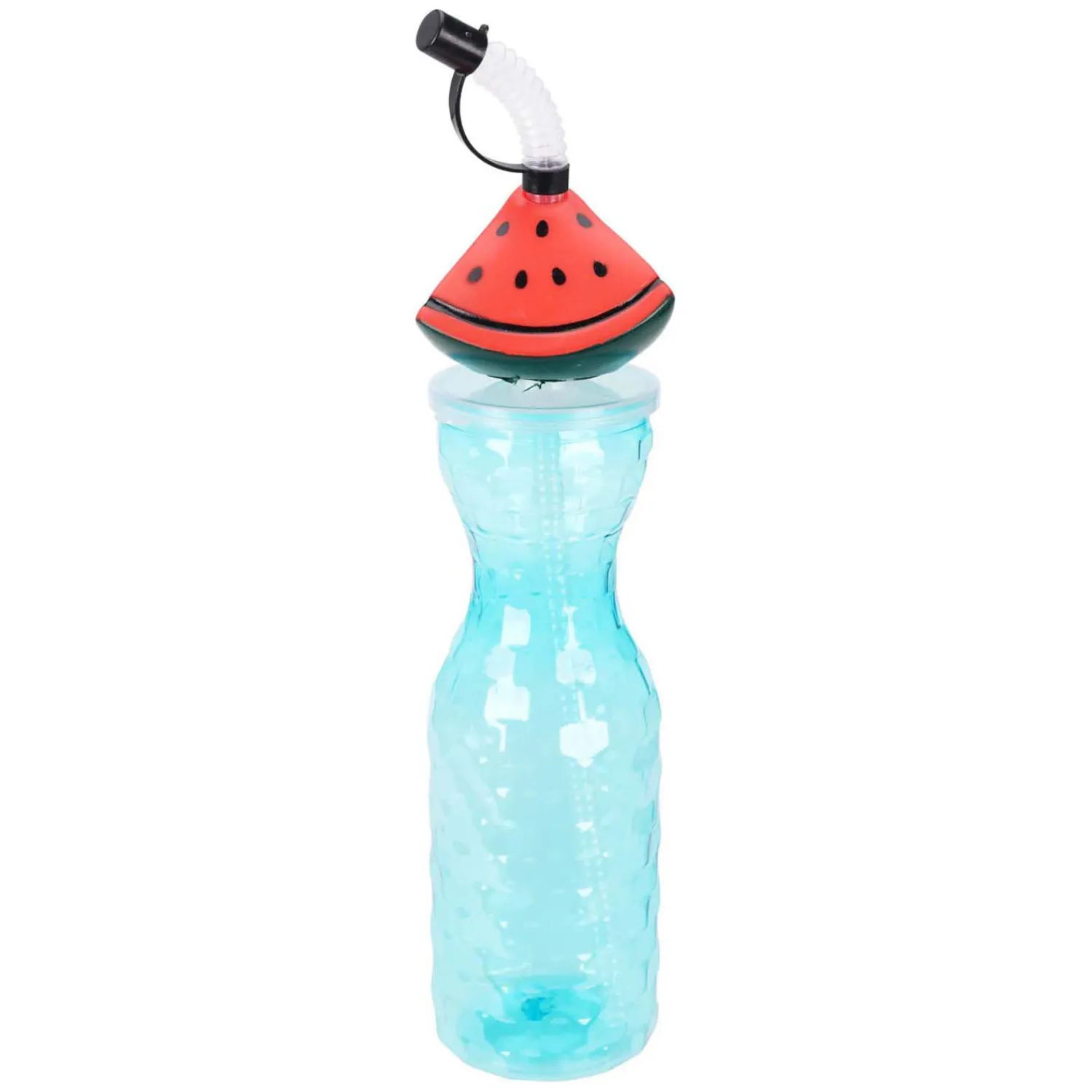 Grappige kunststof drinkbeker met een grote watermeloen erbovenop en een dik, buigzaam rietje met afsluitdop. De blauwe fles heeft een inhoud van 500 ml en heeft een handige vernauwde handgreep voor comfortabel vasthouden. De beker is 31 centimeter hoog. Leuk als (uitdeel)cadeau! Ook verkrijgbaar in andere fruitsoorten.