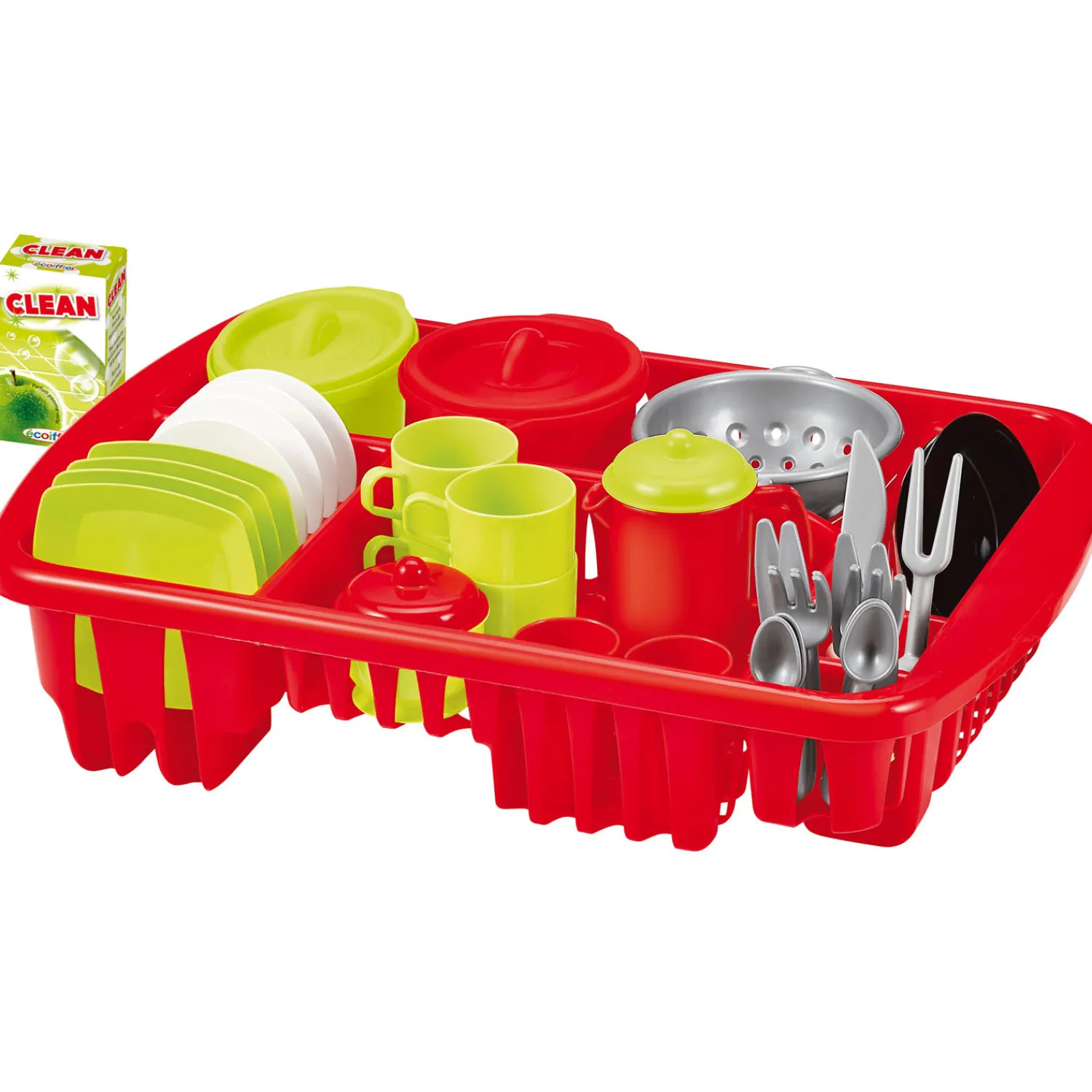 Bij een echt speeldiner hoort echte afwas! Speel vader en moedertje na met deze afwasset van Ecoiffier 100% Chef. Maak een lekker sopje klaar en boen de bordjes, het bestek, de pannen en de bekers schoon. Na het afwassen laat je ze drogen in het bijgeleverde afdruiprek. De 42-delige afwasset is gemaakt van stevig kunststof.