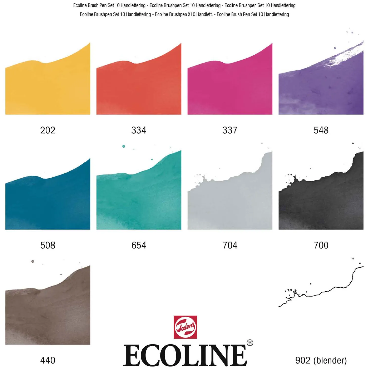 Inhoud: 10 Brush Pens (202 Donkergeel – 334 Scharlaken – 337 Magenta – 548 Blauwviolet – 508 Pruisischblauw – 654 Dennengroen – 704 Grijs – 700 Zwart – 440 Sepia Donker – 902 Blender).