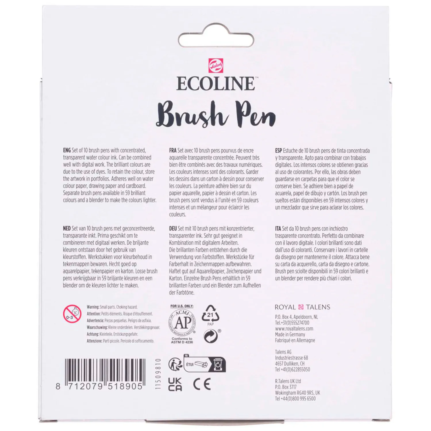 Deze set bevat 10 Ecoline Brush Pens in verschillende levendige tinten. De Brush Pen kenmerkt zich door de flexibele punt en het uitgebreide assortiment schitterende kleuren dankzij de pure formule op kleurstofbasis. De transparante kleuren bieden de beste resultaten bij gebruik op wit of zeer lichtgekleurd papier. Indien gewenst kun je de kleurintensiteit gemakkelijk verminderen door ze te verdunnen met water of met de Brush Pen blender. Deze pennen zijn perfect voor handlettering, aquareltekeningen, snelle schetsen en finishing touches.