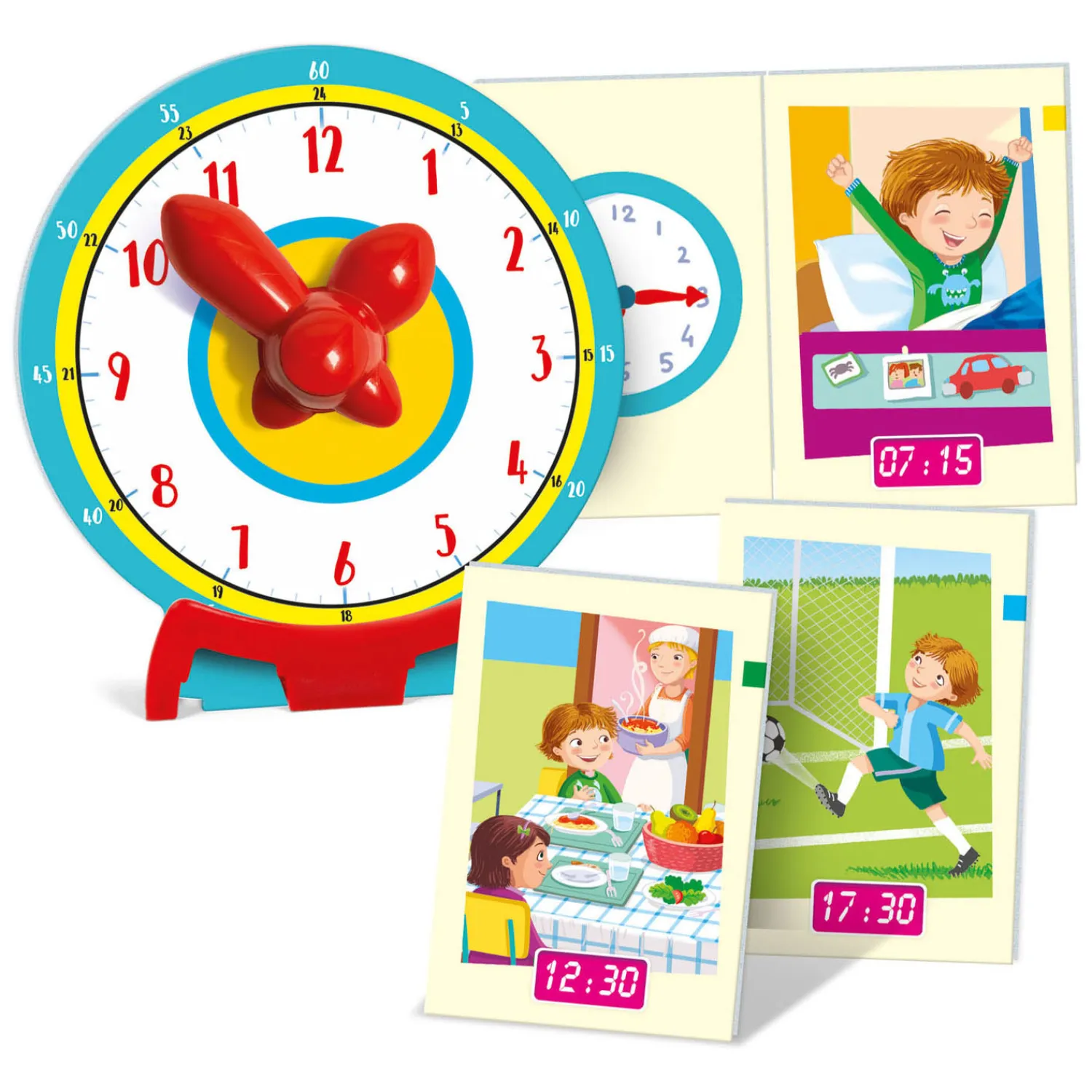 Aan de achterkan van de stukken staan beschrijven van de activiteiten, waarmee kinderen ook meteen kunnen oefenen met lezen en het mondeling aangeven van de tijd. Geschikt voor kinderen van ca. 5 tot 7 jaar oud.