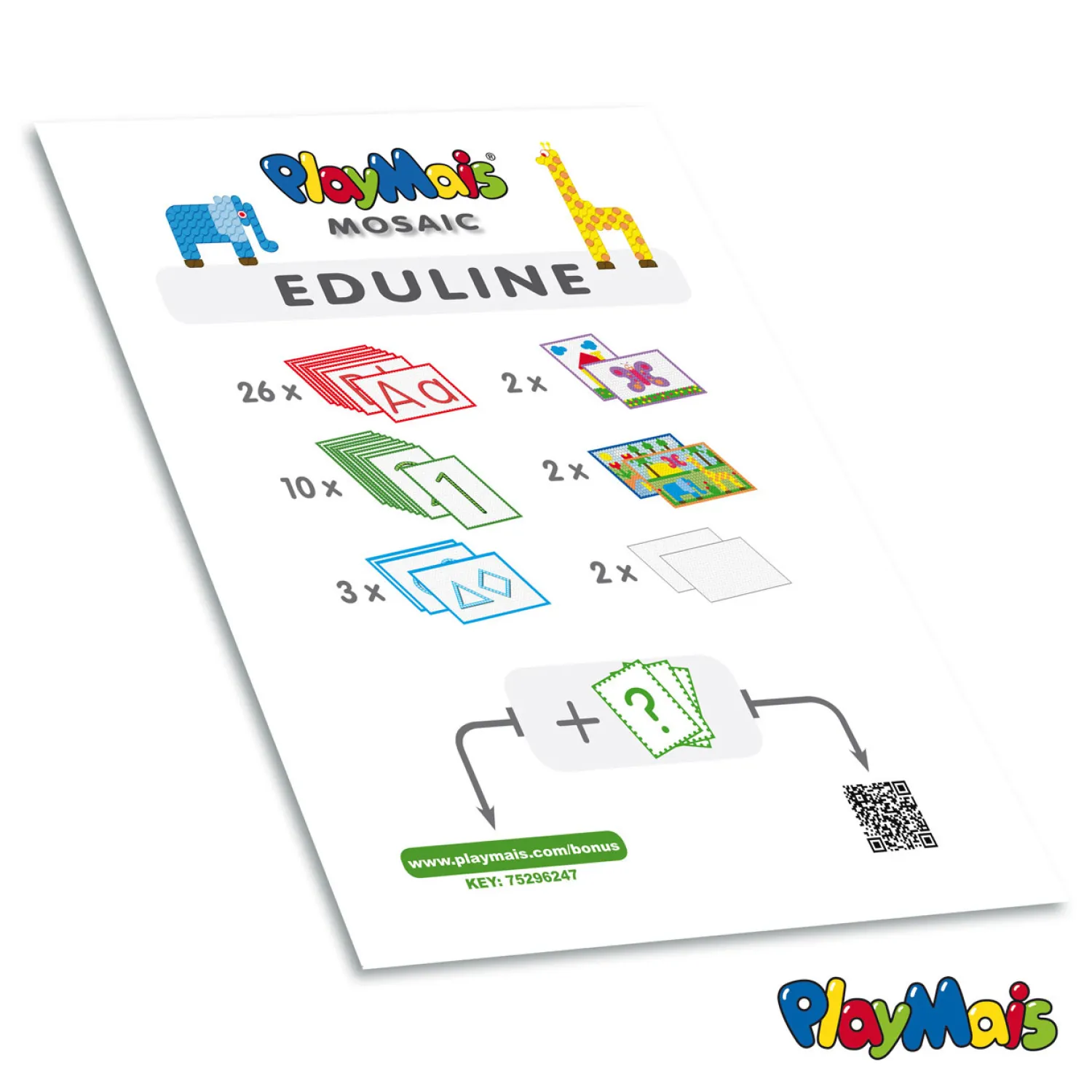Deze PlayMais Eduline Mosaic biedt urenlang speelplezier! Maak de mooiste mozaïeken met de bijgeleverde gedrukte kaarten. De bonte Playmais Mosaic bouwstenen hoeven slechts met een nat doekje vochtig gemaakt te worden en plakken dan aan elkaar. En dat allemaal zonder lijm! PlayMais Mosaic is natuurlijk, veilig en 100% biologisch afbreekbaar. In deze grote box zitten 12.000 PlayMais Mosaic bouwstenen, doekjes voor het bevochtigen, 43 gedrukte kaarten en 2 blanco kaarten.